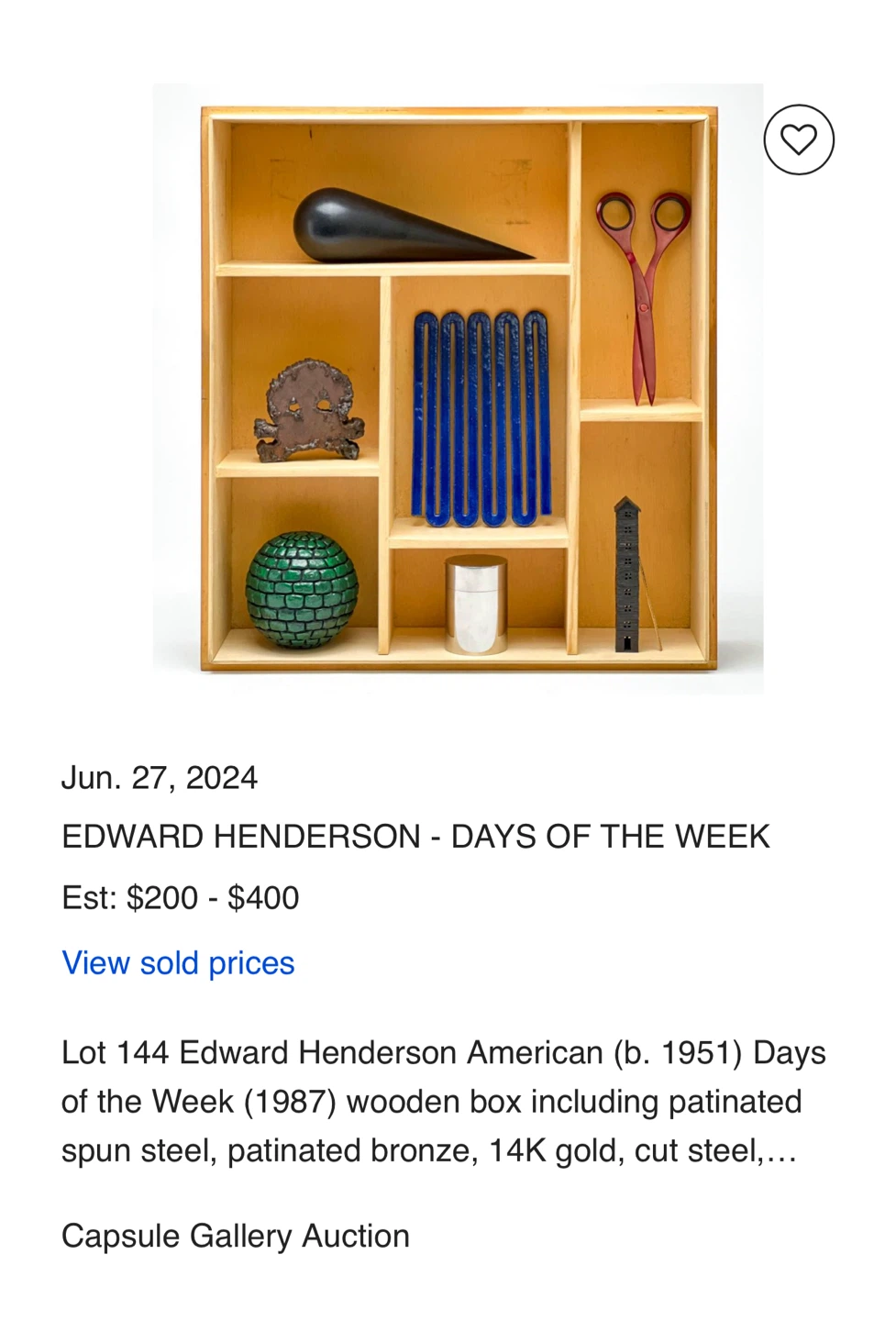 "Days of the Week" is a piece of art created by artist Edward Henderson in 1987, likely referring to a sculpture or installation that visually represents the seven days of the week through various materials and forms.
