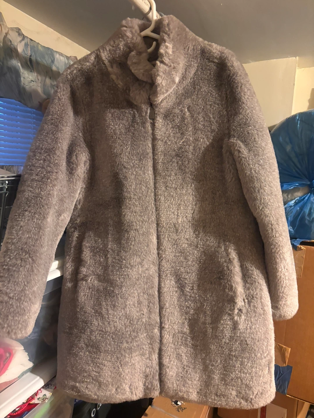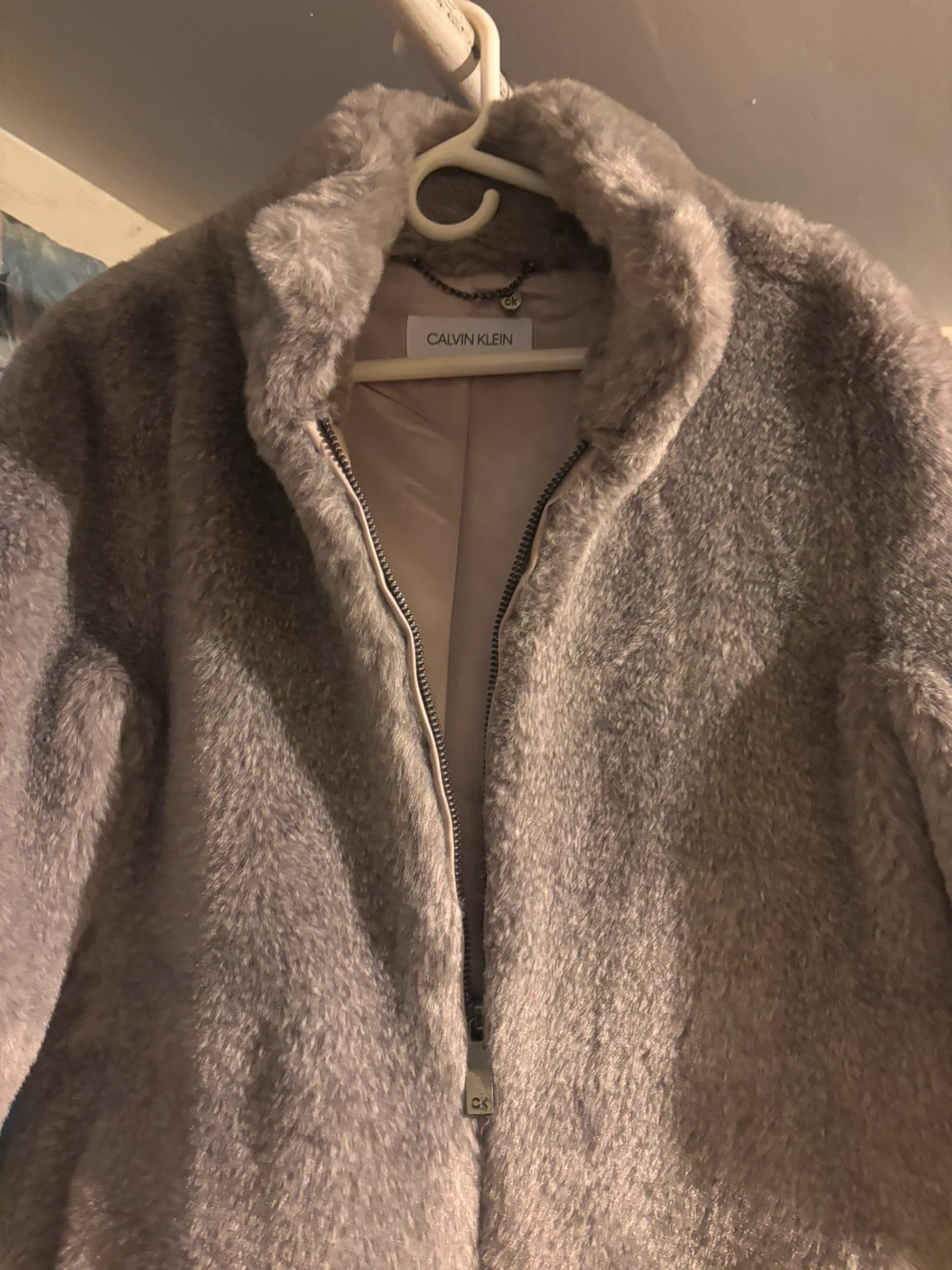 Calvin Klein faux fur coat in a light grey color. It's a zip-up style with pockets. Great for staying warm!