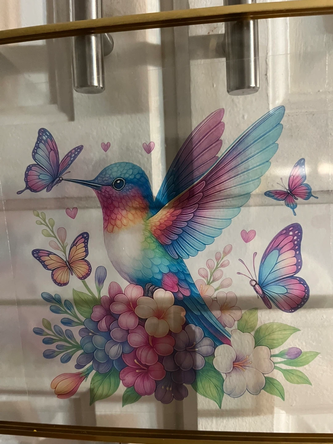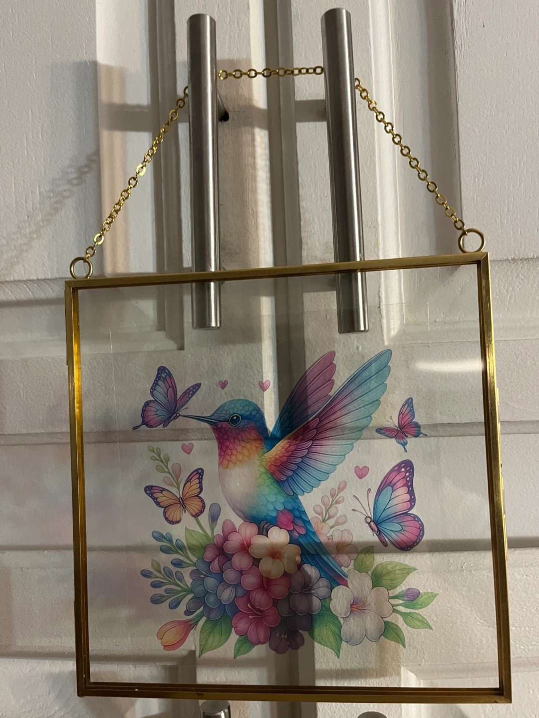 This decorative glass frame features a vibrant hummingbird surrounded by colorful butterflies and flowers. It's perfect for adding a touch of nature-inspired art to any room. The frame is made with clear glass and a gold-colored metal border, and includes a hanging chain.