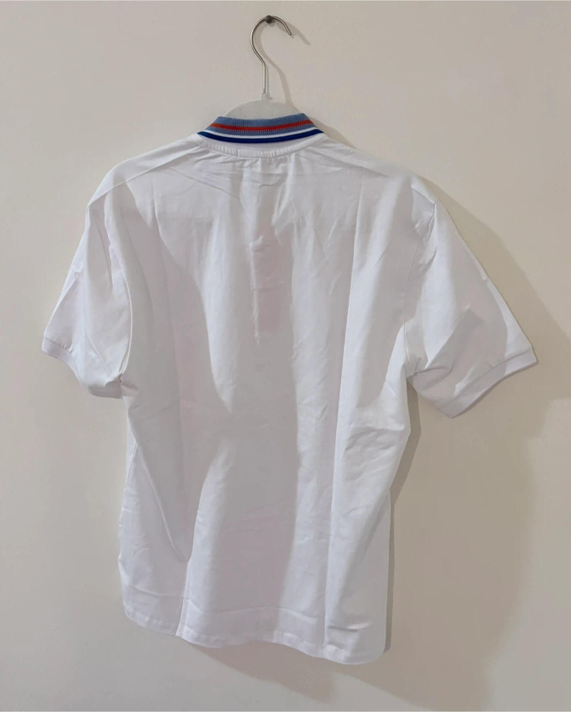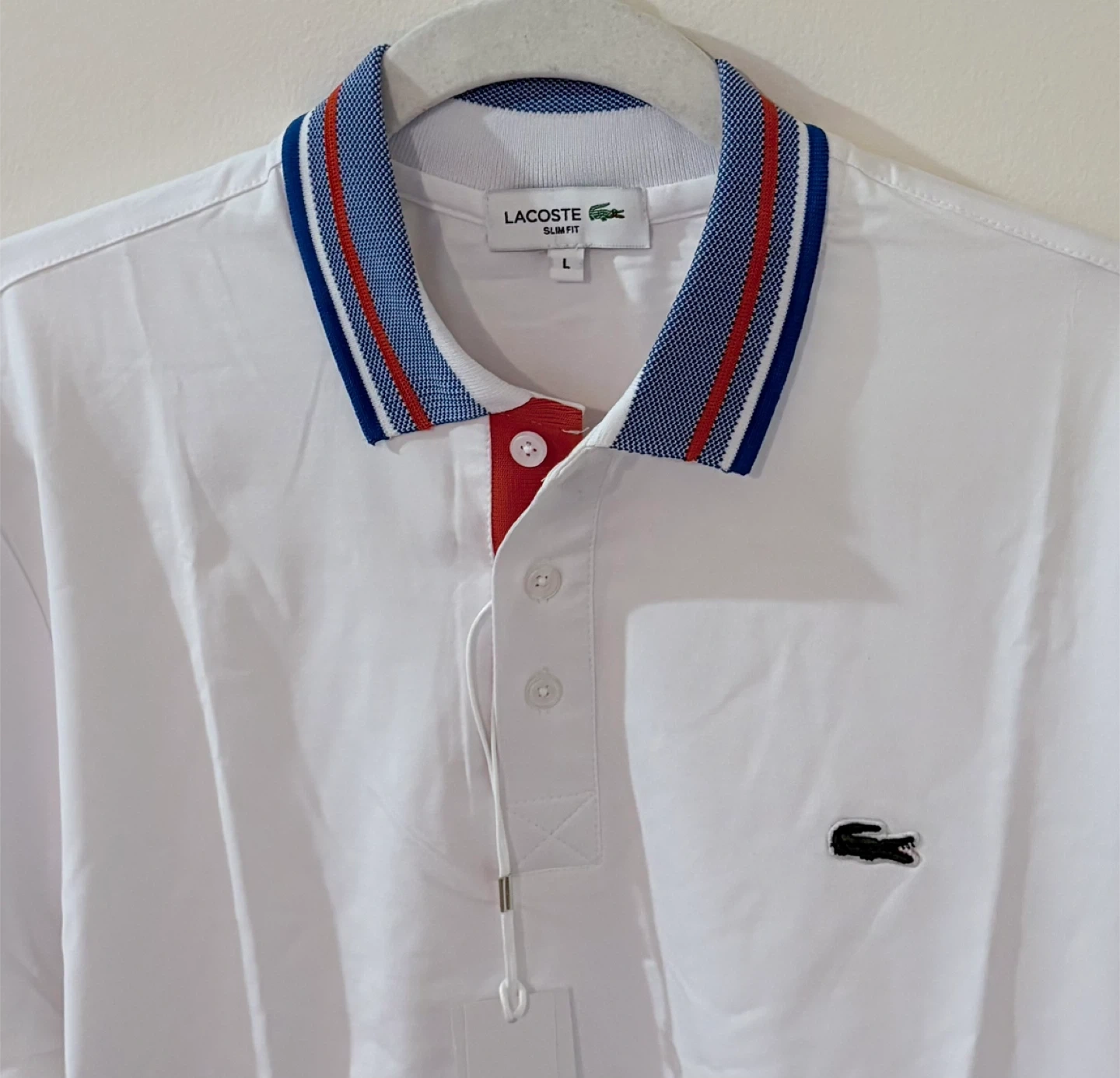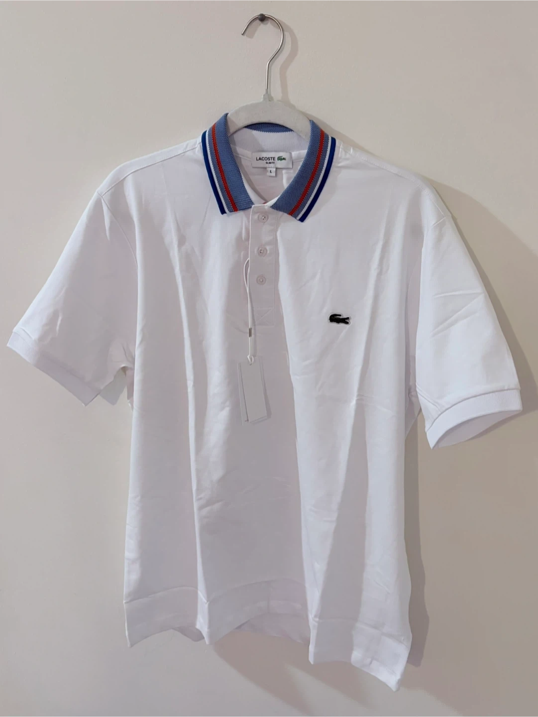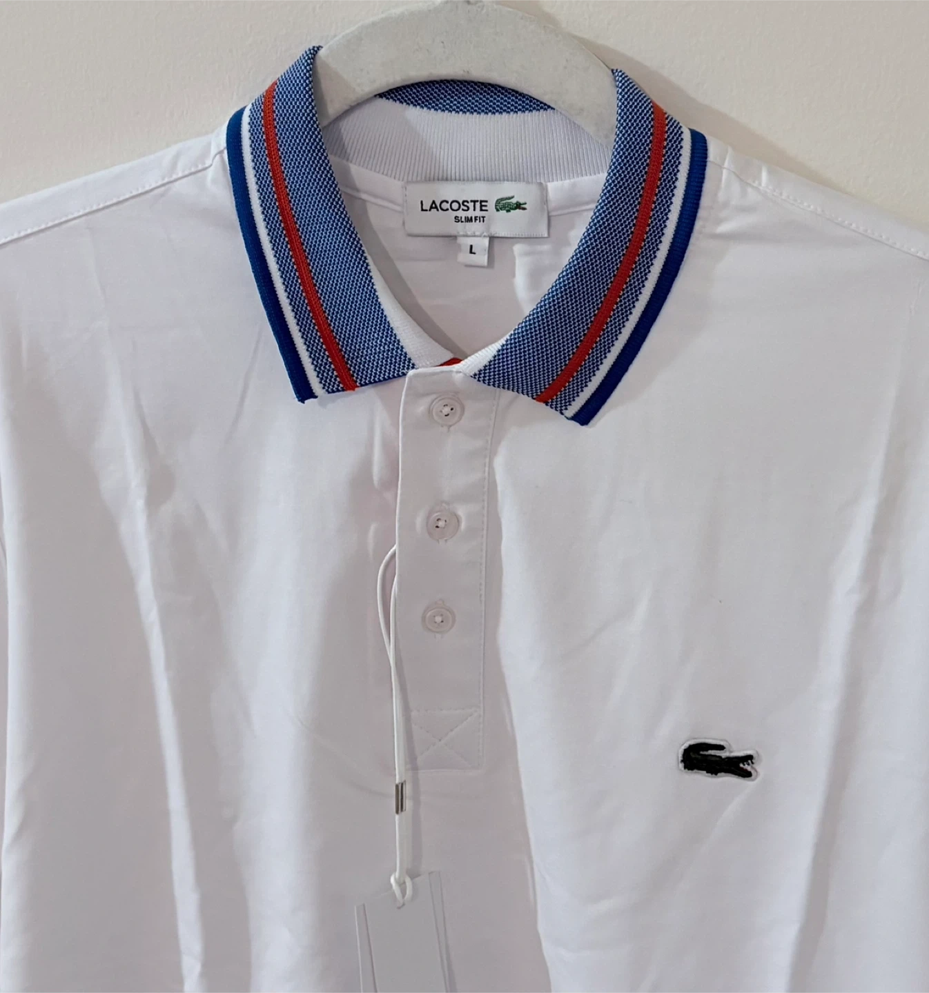 White Lacoste polo shirt with a blue, red, and white striped collar. It's a men's size L and features the signature crocodile logo. Slim fit design.