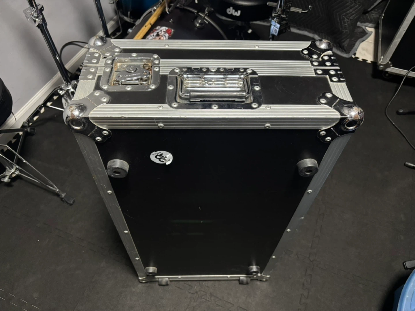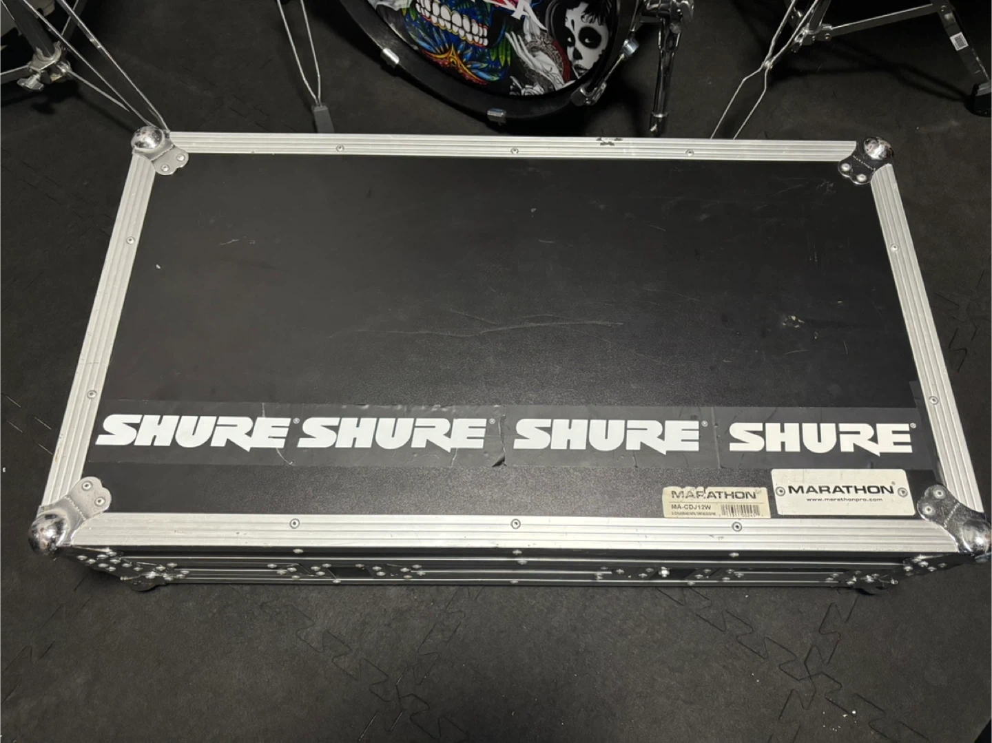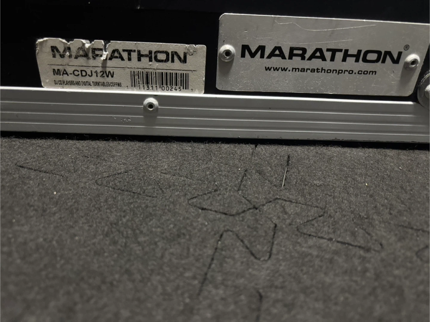 This is a Marathon MA-CDJ12W flight case designed for DJ CD players and digital turntables. It features a sturdy construction with metal and carpeted interior. The interior measures approximately 17 inches long.