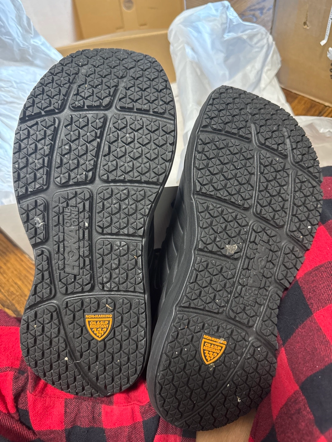 Black Hoka One One M Bondi SR shoes with maximum cushion. These shoes are oil-resistant and non-marking. Designed for comfort and support. Runs narrow.