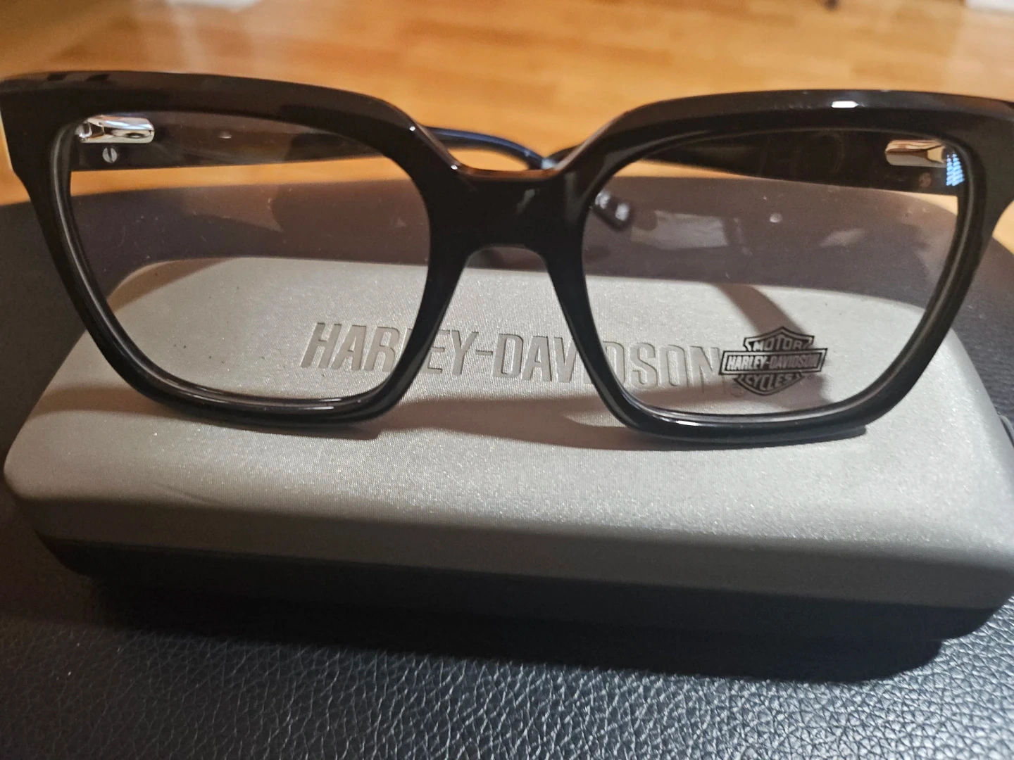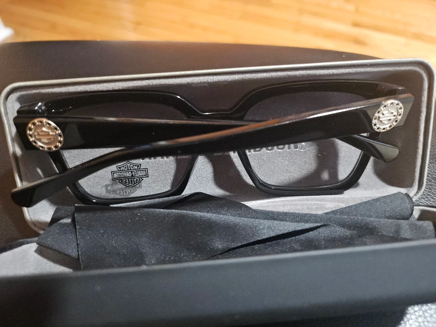 Harley-Davidson eyeglasses in black. Model HD50107 with lens width 52mm and bridge width 18mm. Includes original case and cleaning cloth. Made in China.