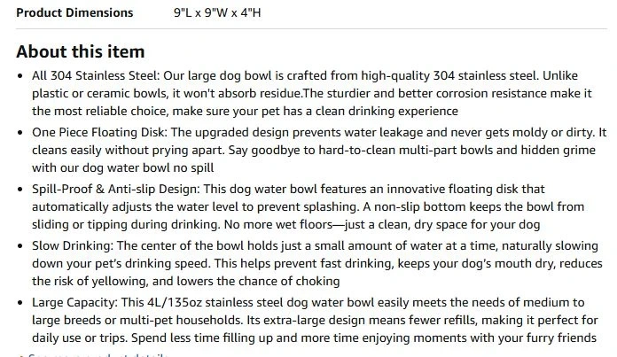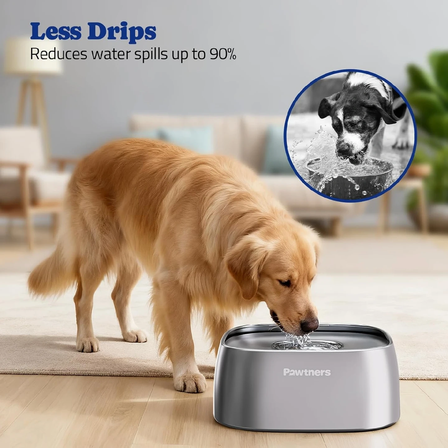 Spill-Proof & Anti-slip Design: This dog water bowl features an innovative floating disk that automatically adjusts the water level to prevent splashing. A non-slip bottom keeps the bowl from sliding or tipping during drinking. No more wet floors—just a clean, dry space for your dog