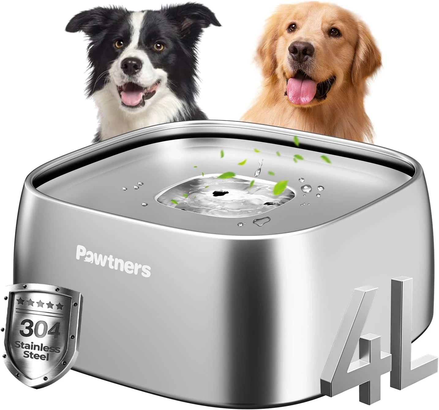No Spill Water Bowl for Dogs, 135oz/4L All Stainless Steel Dog Water Bowl with Non-Slip Base, Spill Proof for Medium Large Messy Drinkers, Anti Splash, Slow Drinking, Slobber Stopper, Silver