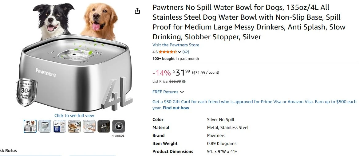 NEW 4L All Stainless Steel Dog Water Bowl with Non-Slip Base