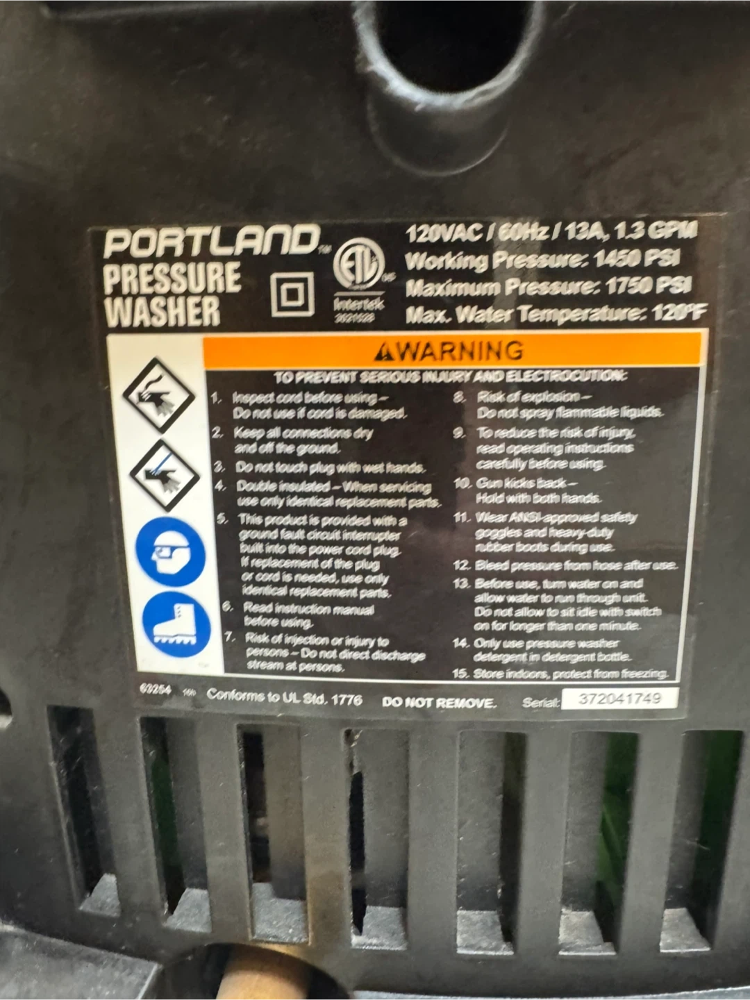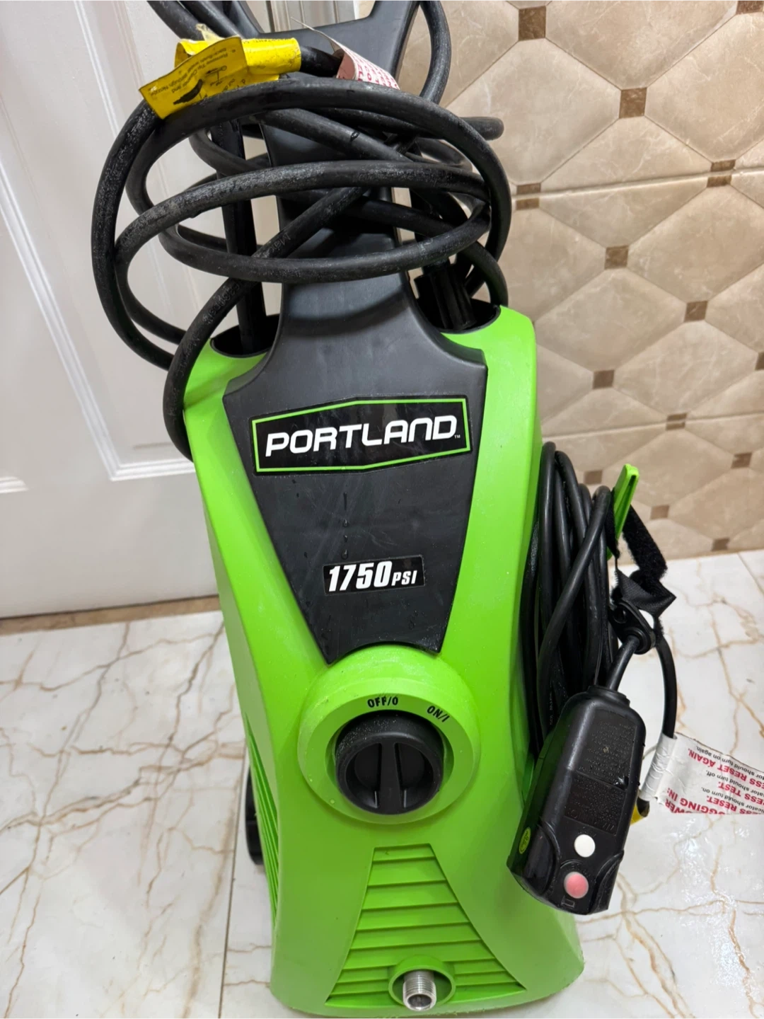 De segunda mano. This Portland pressure washer offers a maximum of 1750 PSI. It operates on 120V/60Hz and has a 13A, 1.3 GPM rating. It's ideal for cleaning driveways, decks, and vehicles.