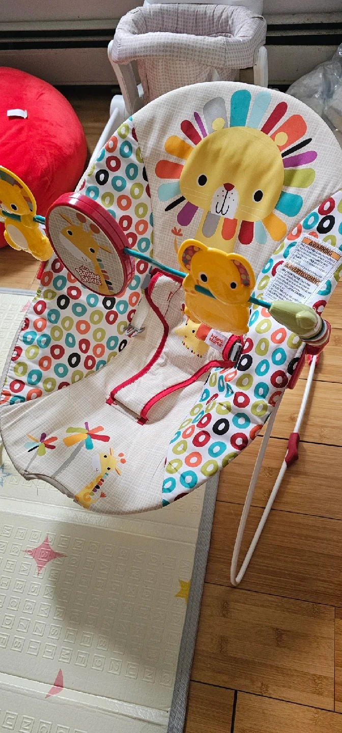Selling a Bright Starts baby bouncer with a cute lion design! It features a toy bar with adorable animal characters to entertain your little one. The seat is patterned with colorful circles and playful giraffes and palm trees. Perfect for keeping your baby happy and comfortable!