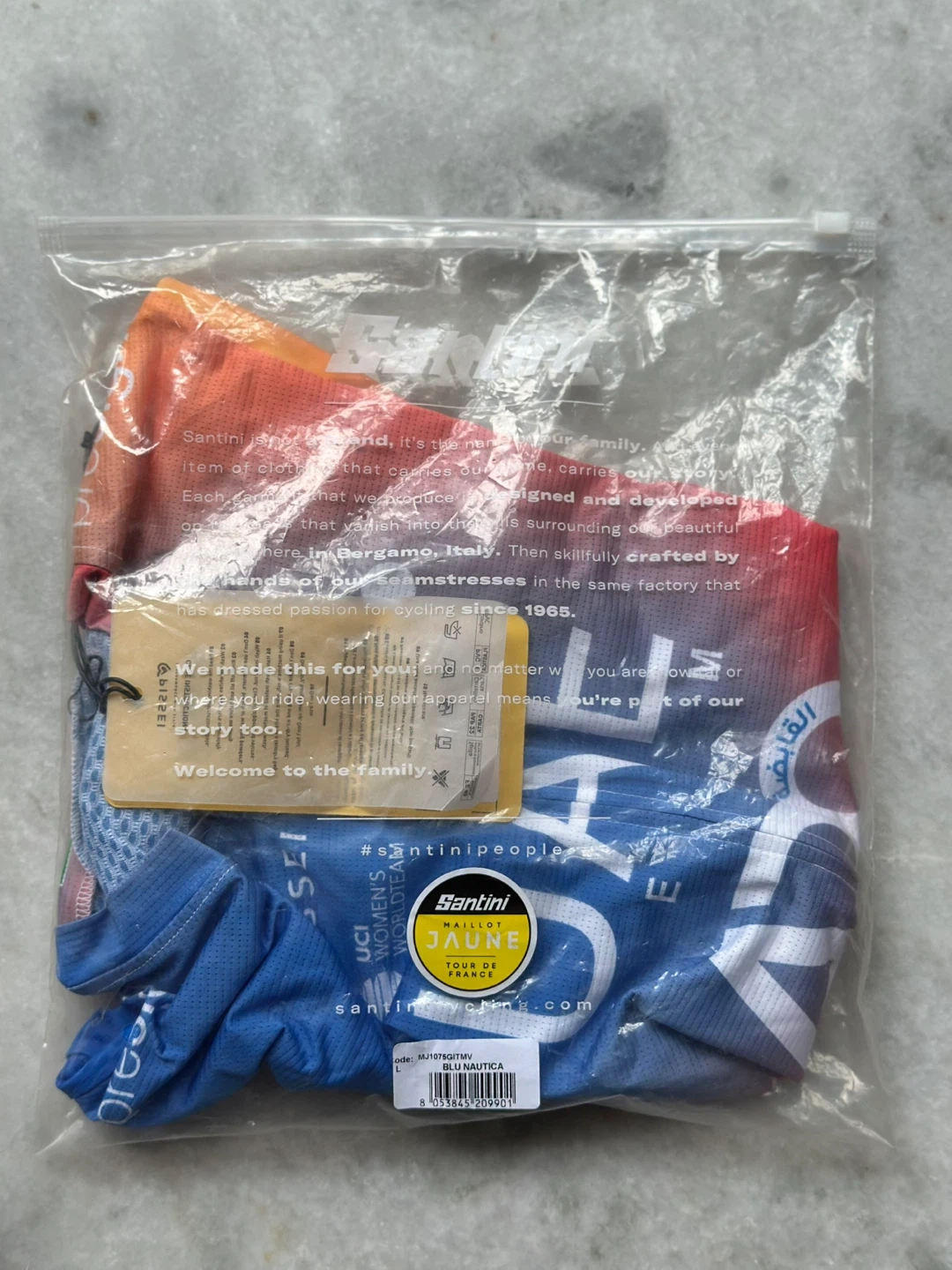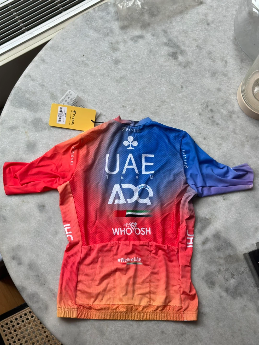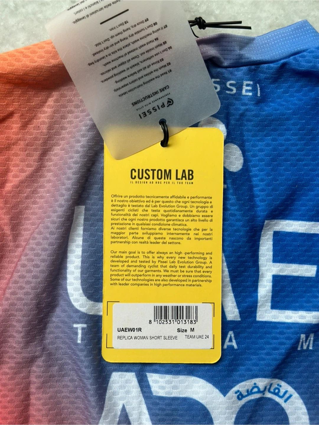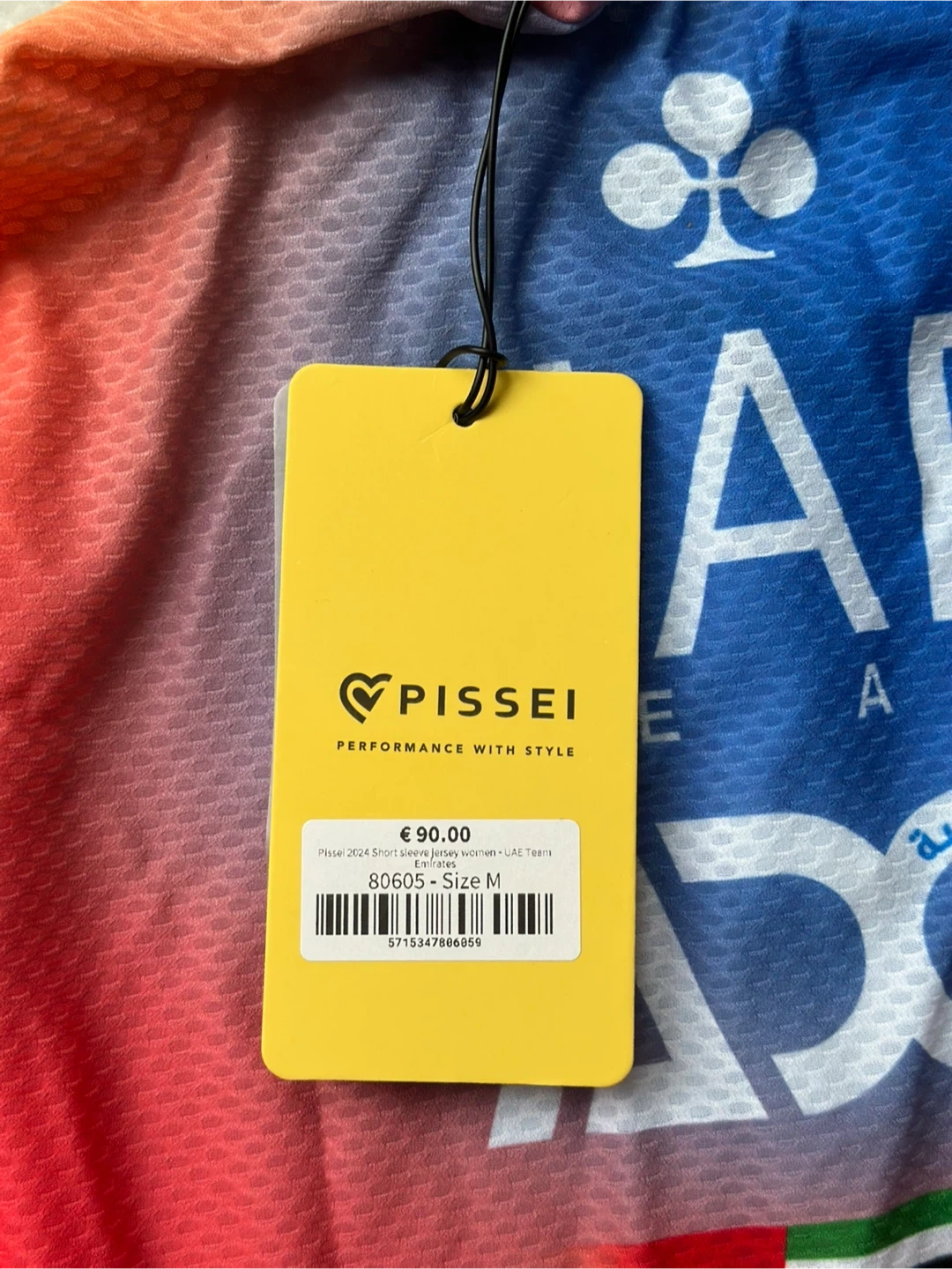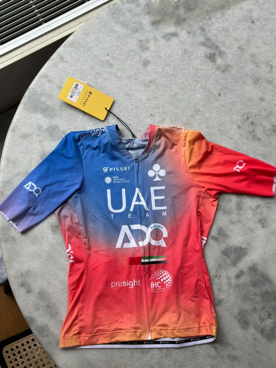 Selling a brand new Pissei short sleeve cycling jersey. It's a women's size M from the UAE Team collection. The color is Blu Nautico. Bought at TDF. Performance wear with style.