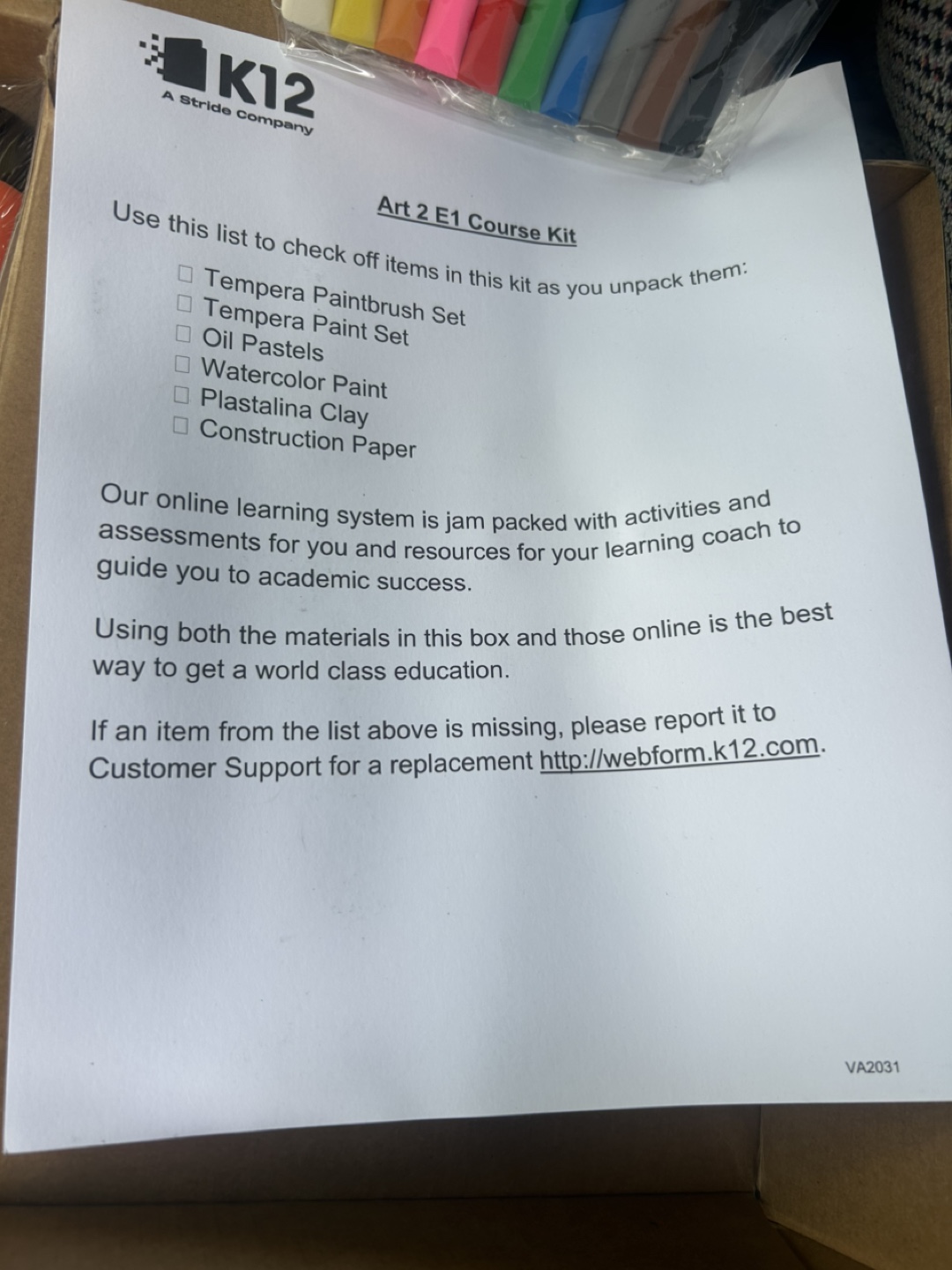 Selling a K12 Art 2 E1 Course Kit. It includes tempera paintbrushes, tempera paint set, oil pastels, watercolor paint, plastalina clay, and construction paper. Perfect for young artists!