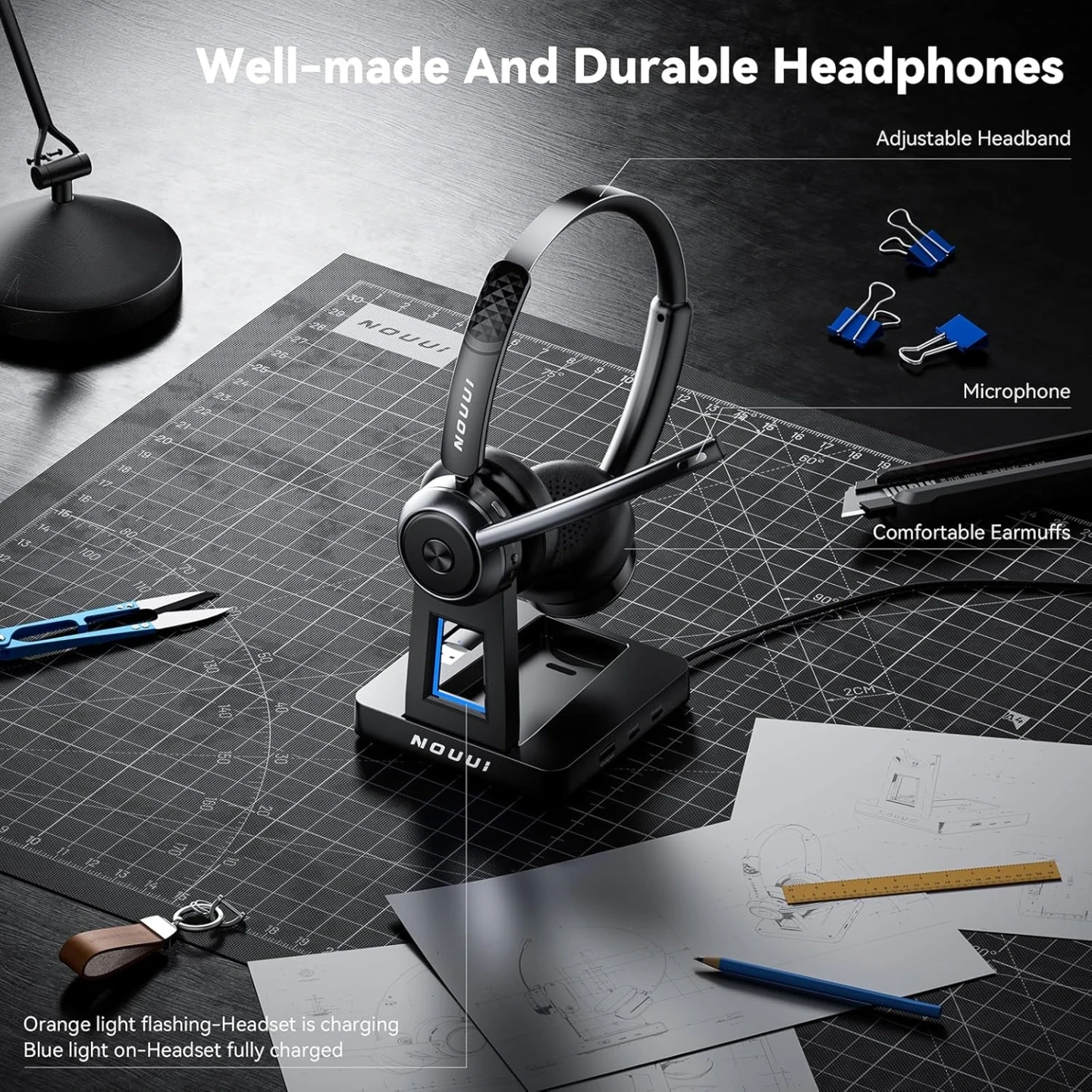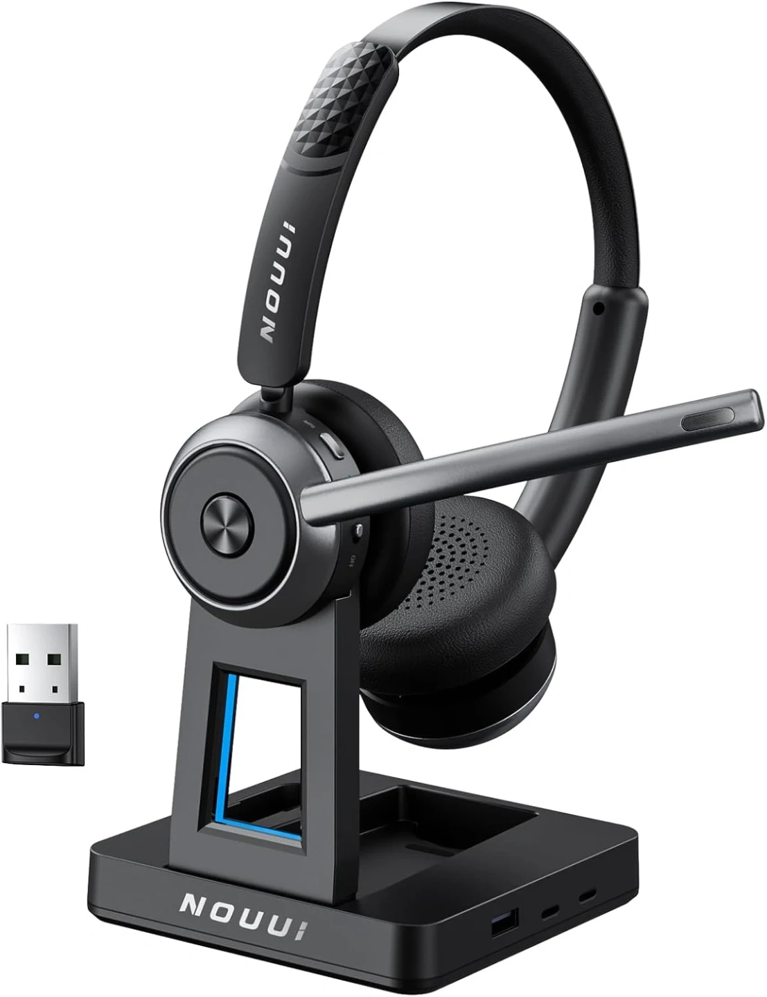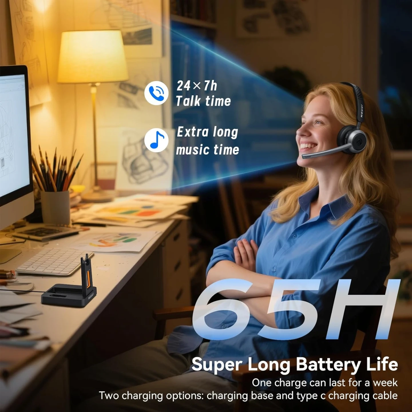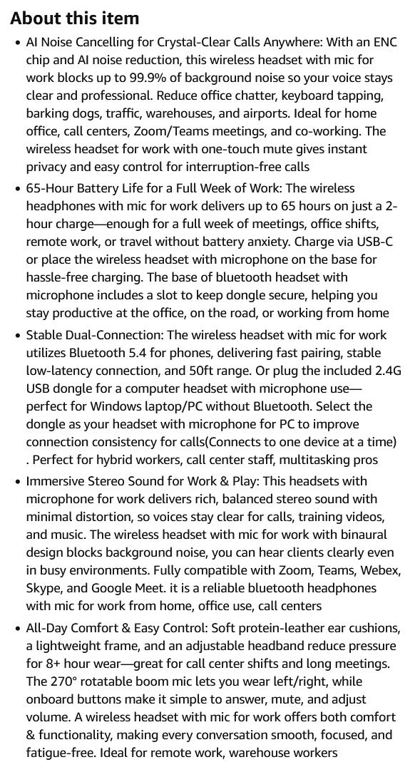 65-Hour Battery Life for a Full Week of Work: The wireless headphones with mic for work delivers up to 65 hours on just a 2-hour charge—enough for a full week of meetings, office shifts, remote work, or travel without battery anxiety. Charge via USB-C or place the wireless headset with microphone on the base for hassle-free charging. The base of bluetooth headset with microphone includes a slot to keep dongle secure, helping you stay productive at the office, on the road, or working from home