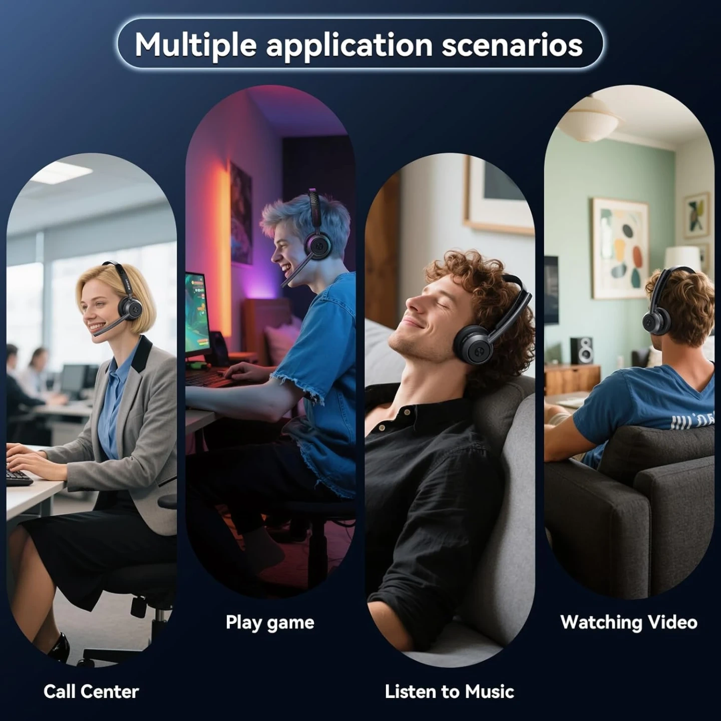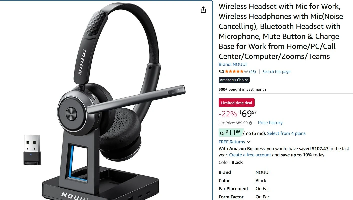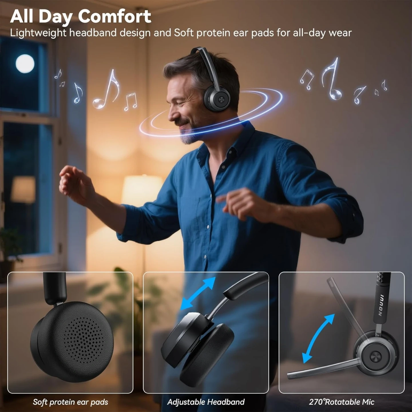 65-Hour Battery Life for a Full Week of Work: The wireless headphones with mic for work delivers up to 65 hours on just a 2-hour charge—enough for a full week of meetings, office shifts, remote work, or travel without battery anxiety. Charge via USB-C or place the wireless headset with microphone on the base for hassle-free charging. The base of bluetooth headset with microphone includes a slot to keep dongle secure, helping you stay productive at the office, on the road, or working from home