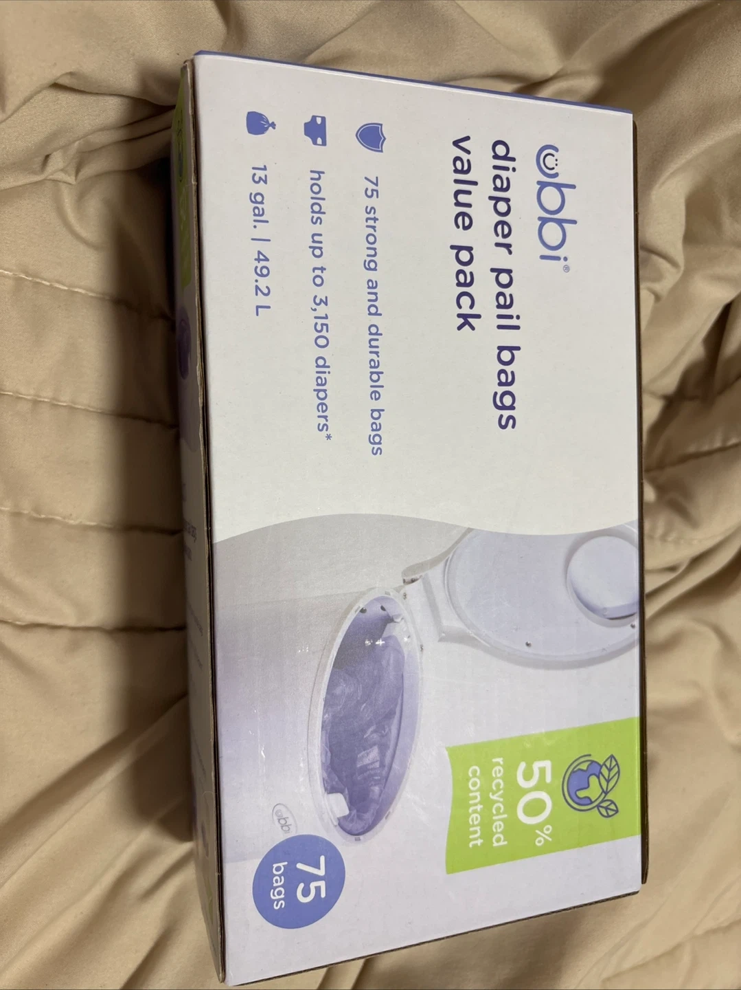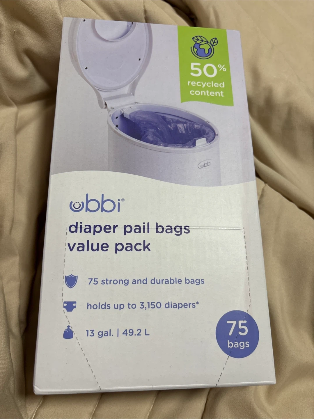 Selling a value pack of Ubbi diaper pail bags. This pack includes 75 strong and durable bags, each with a capacity of 13 gallons (49.2 L). They can hold up to 3,150 diapers. The bags are made with 50% recycled content, so you can feel good about using them!