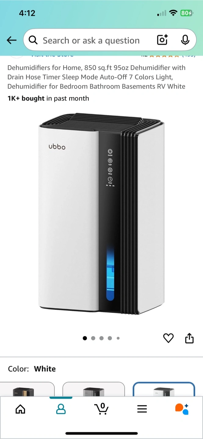 Selling an Ubbo dehumidifier, perfect for spaces up to 850 sq.ft! It features a 95oz capacity, drain hose, timer, sleep mode, and auto-off function. It also has 7 color lights, making it a great addition to any bedroom, bathroom, basement, or RV. The color is white