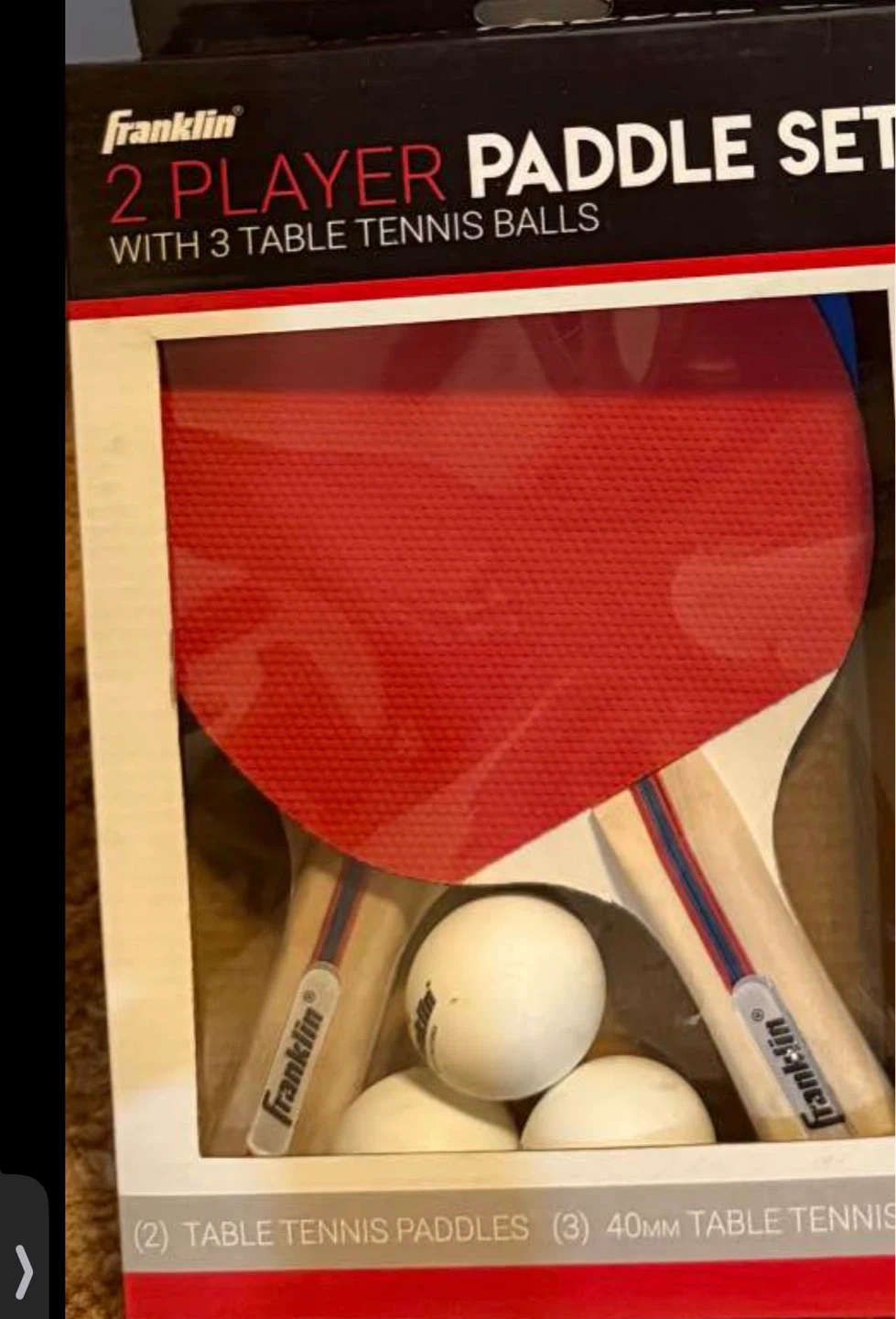 New Franklin 2 player paddle set with 3 table tennis balls. Includes two paddles and three 40mm balls. It's perfect for starting a game with a friend!