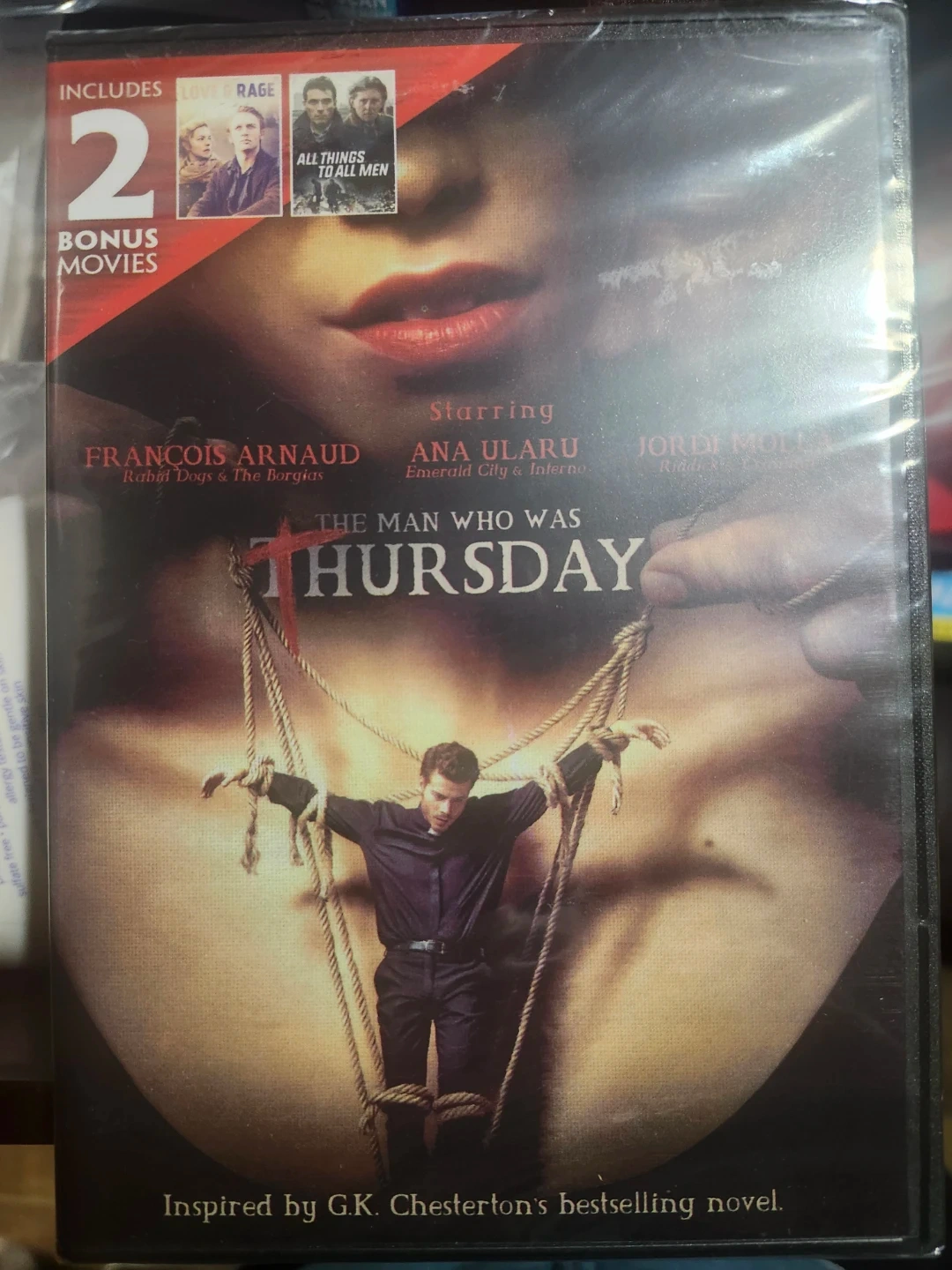 This DVD features the movie "The Man Who Was Thursday" and includes two bonus movies, "Love & Rage" and "All Things to All Men." It's inspired by G.K. Chesterton's bestselling novel. The disc contains multiple films.