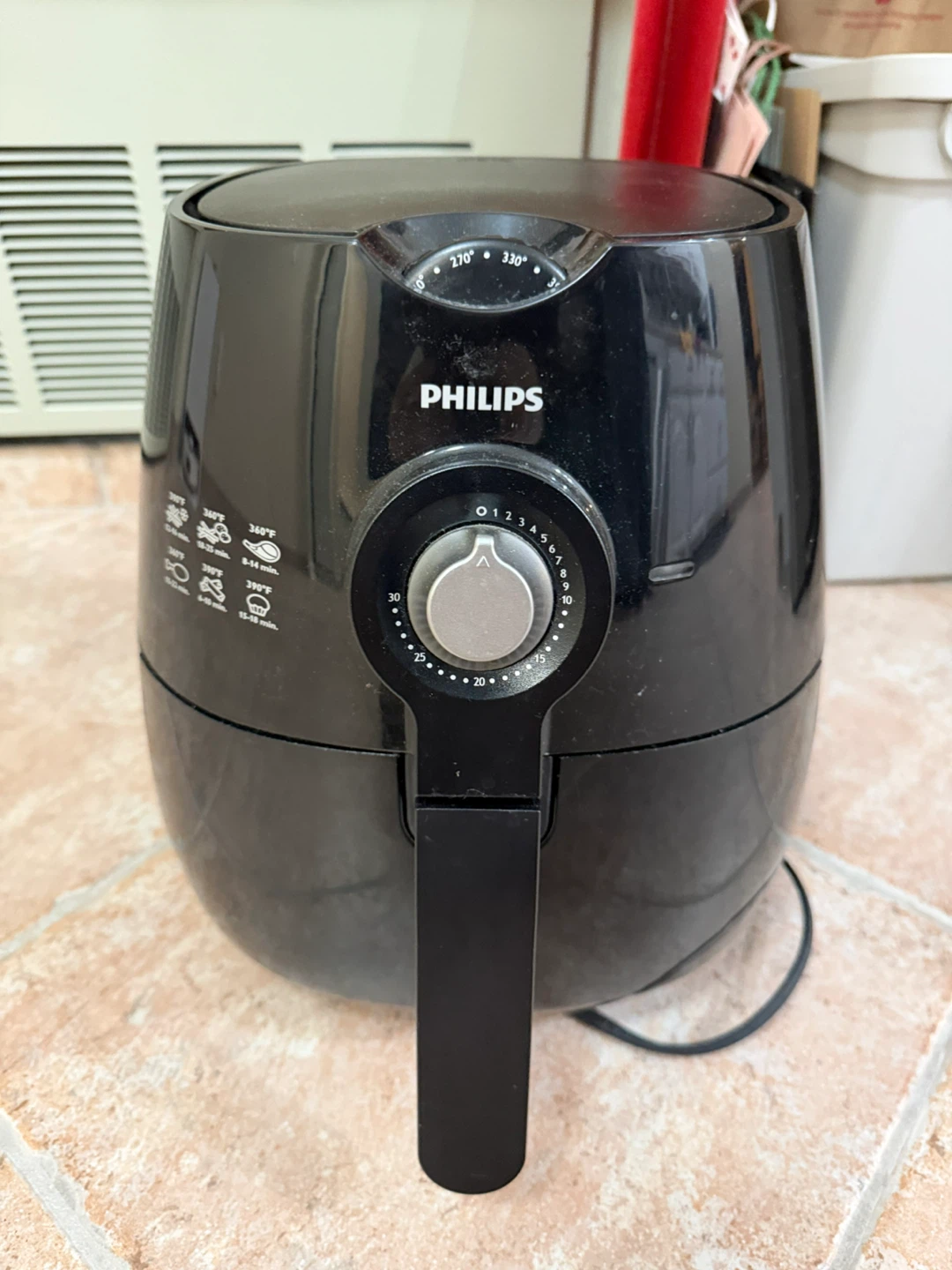 Selling a Philips Airfryer. This airfryer can reach temperatures of 360°F and 390°F. It also has a timer with settings from 0-30 minutes. Perfect for cooking a variety of meals!