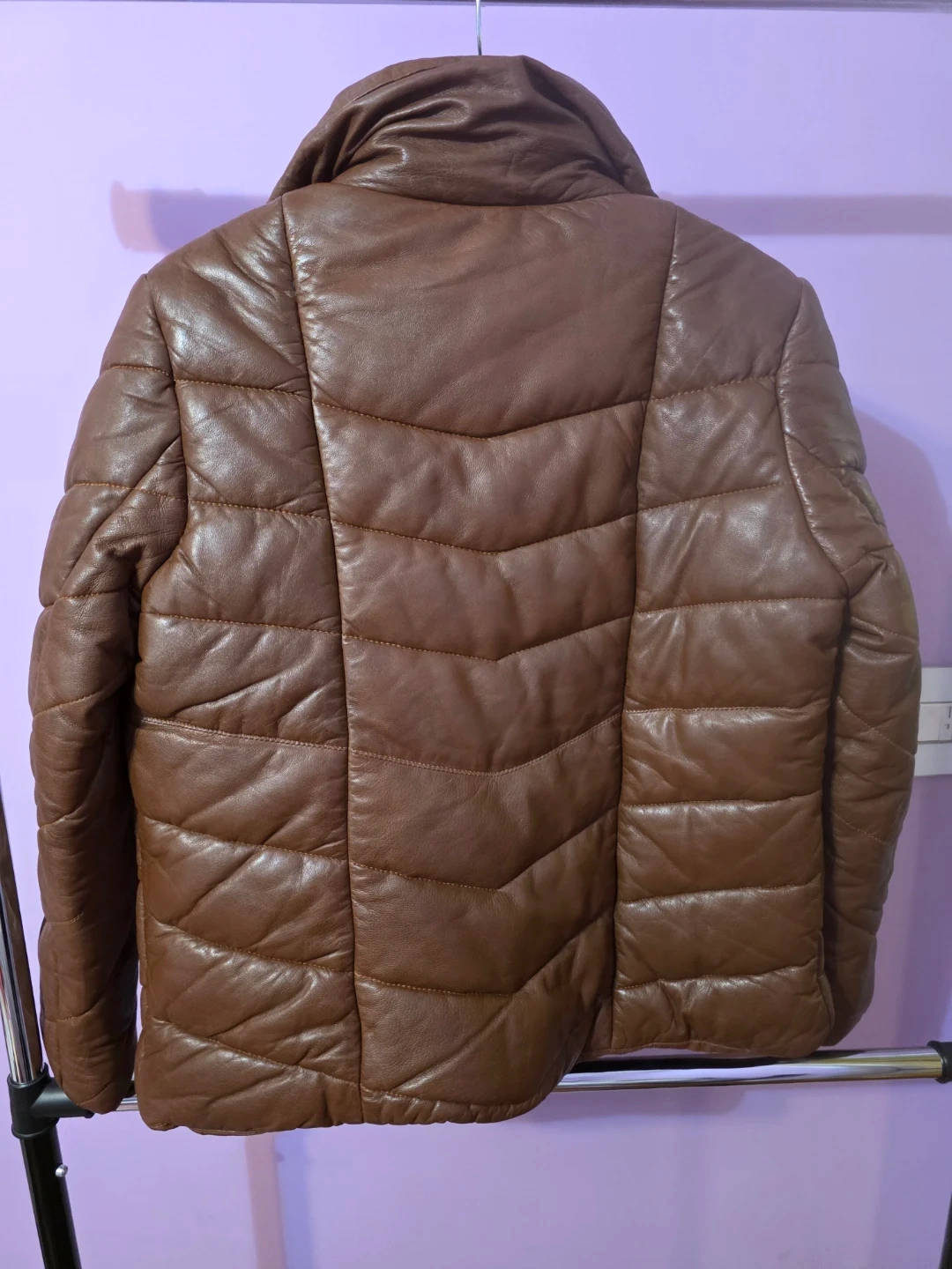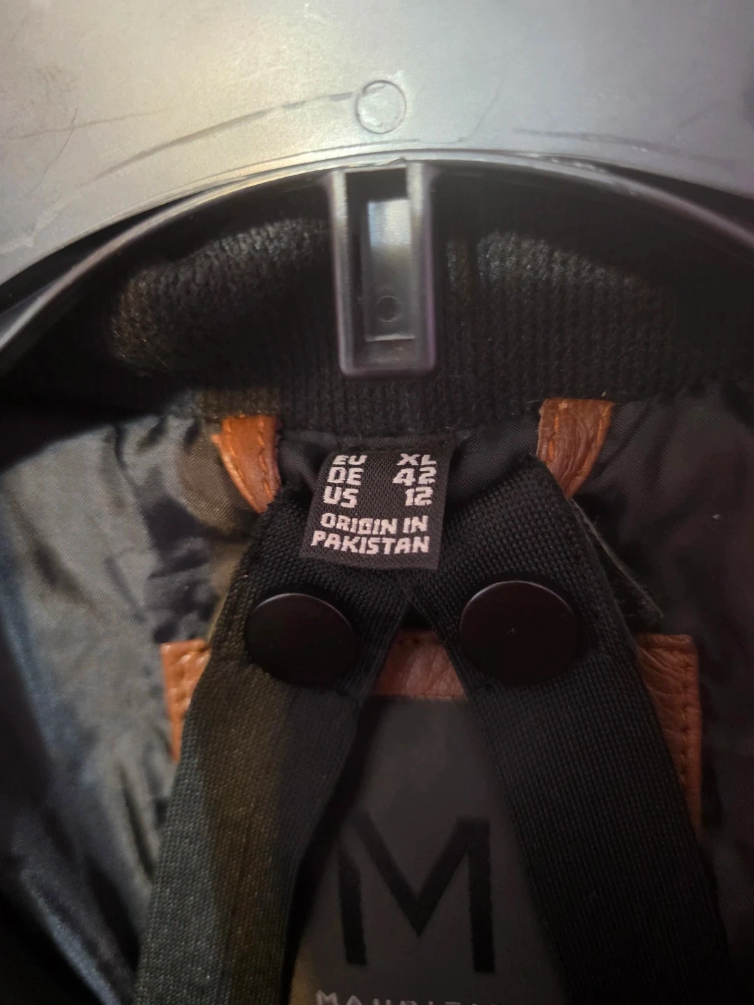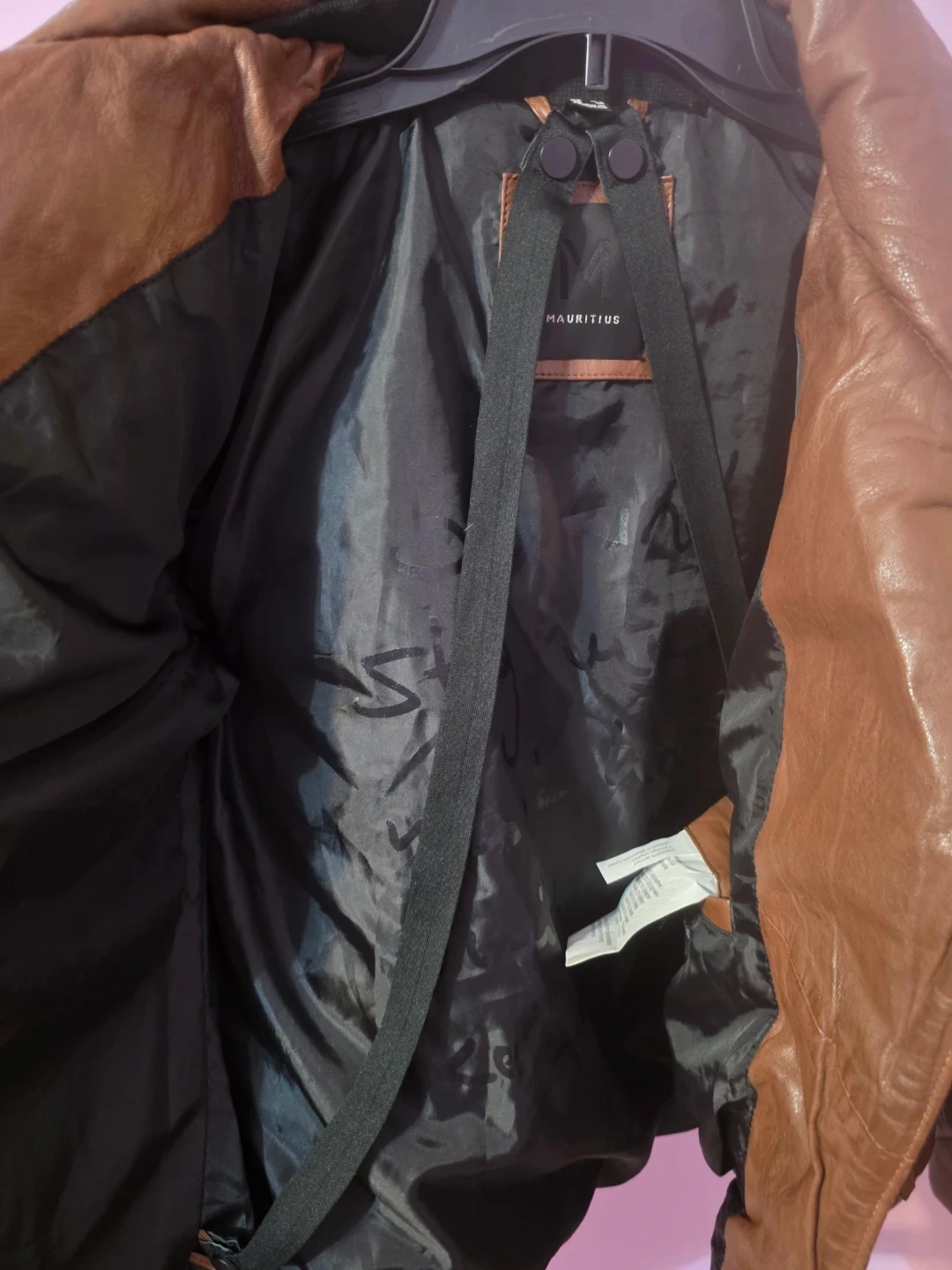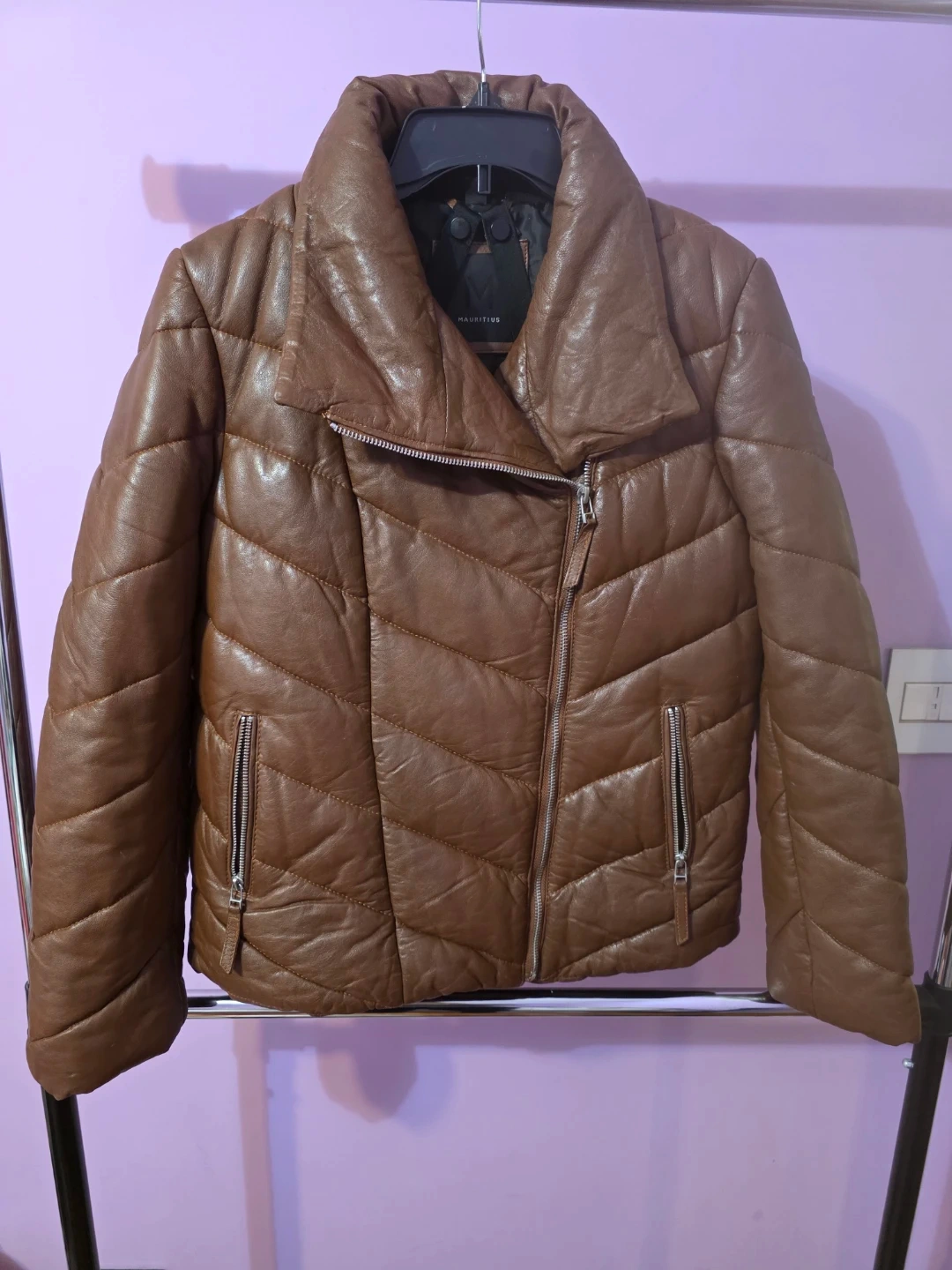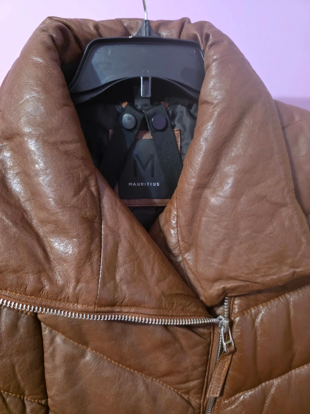 Here's a stylish Mauritius leather jacket in women's size XL! It's made with 100% lamb leather for the shell and 100% polyester for the body and sleeve lining. It's a great piece to add to your wardrobe