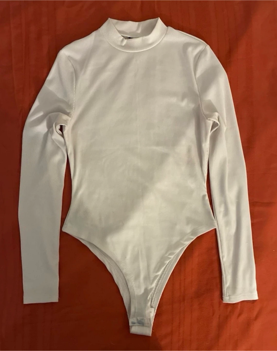 This is a white long sleeve bodysuit with a turtle neck. It's made of a ribbed knit material. The snap closure is at the bottom for convenience.