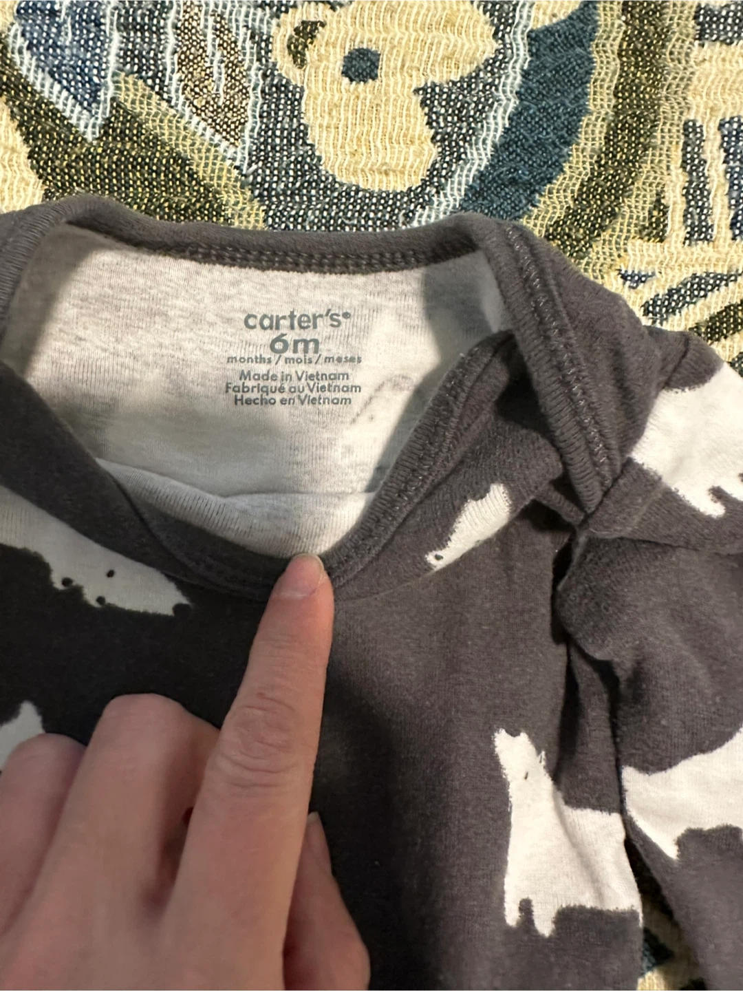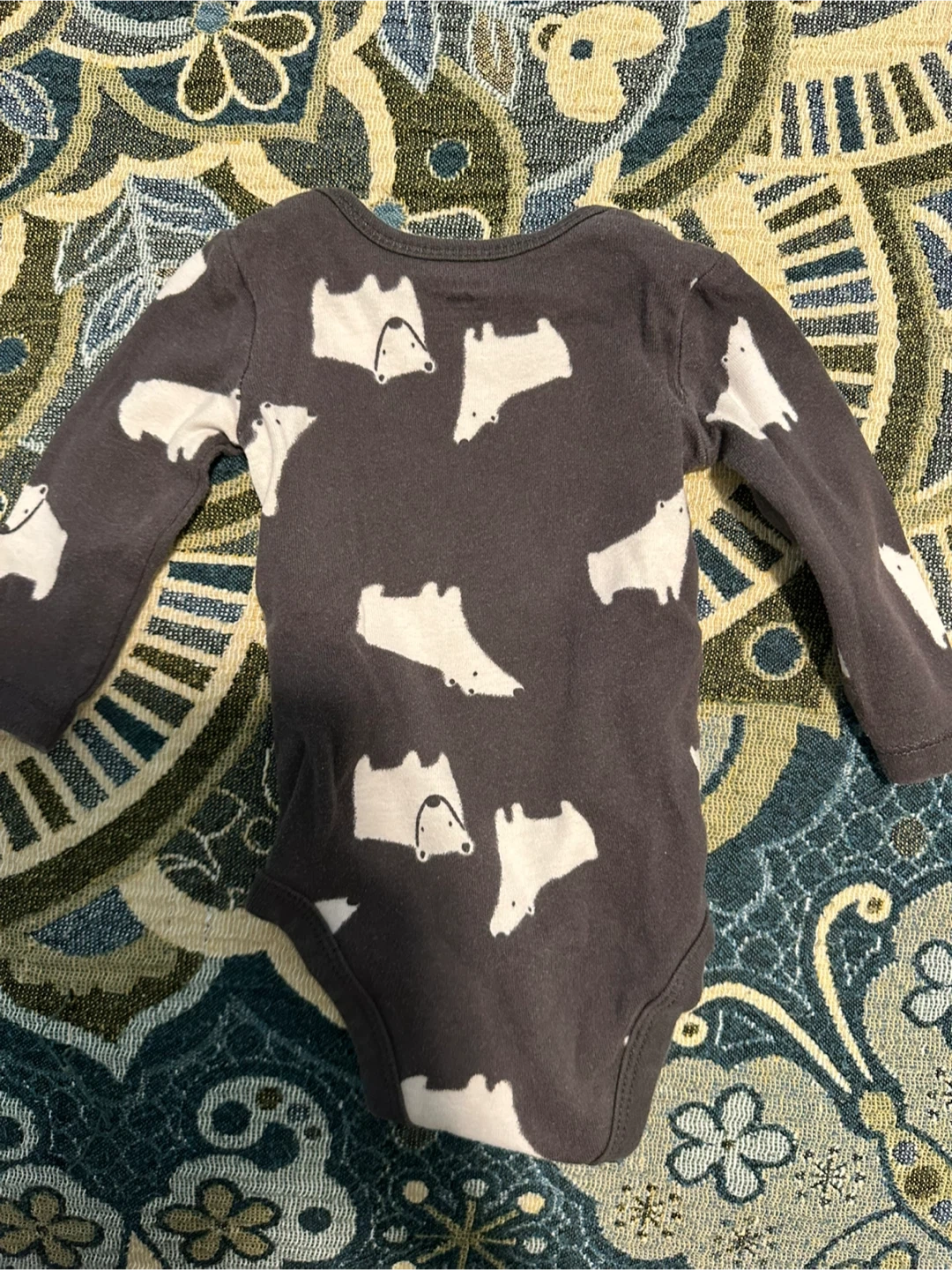 Carter's long-sleeve baby bodysuit in a size 6 months. It features a cute all-over polar bear print on a dark gray background. Made from a soft cotton blend for comfort.
