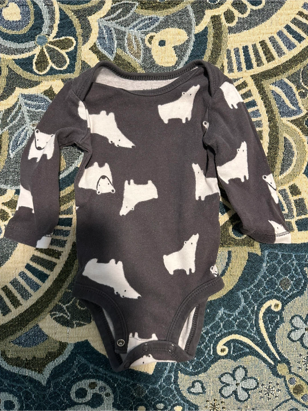 Carter's long-sleeve baby bodysuit in a size 6 months. It features a cute all-over polar bear print on a dark gray background. Made from a soft cotton blend for comfort.