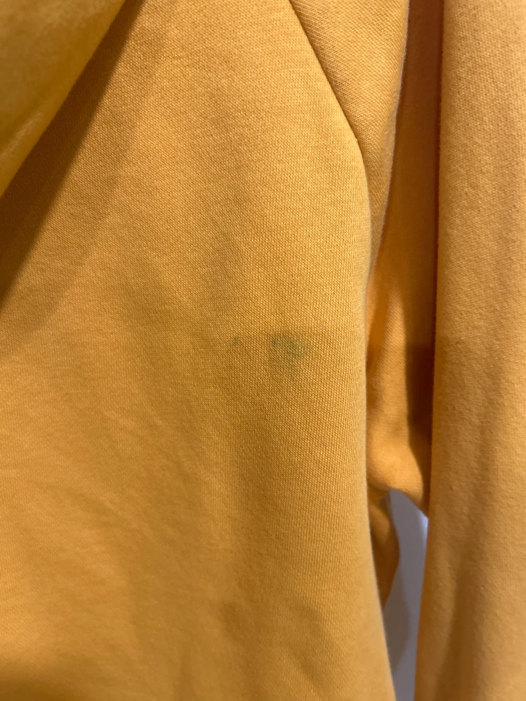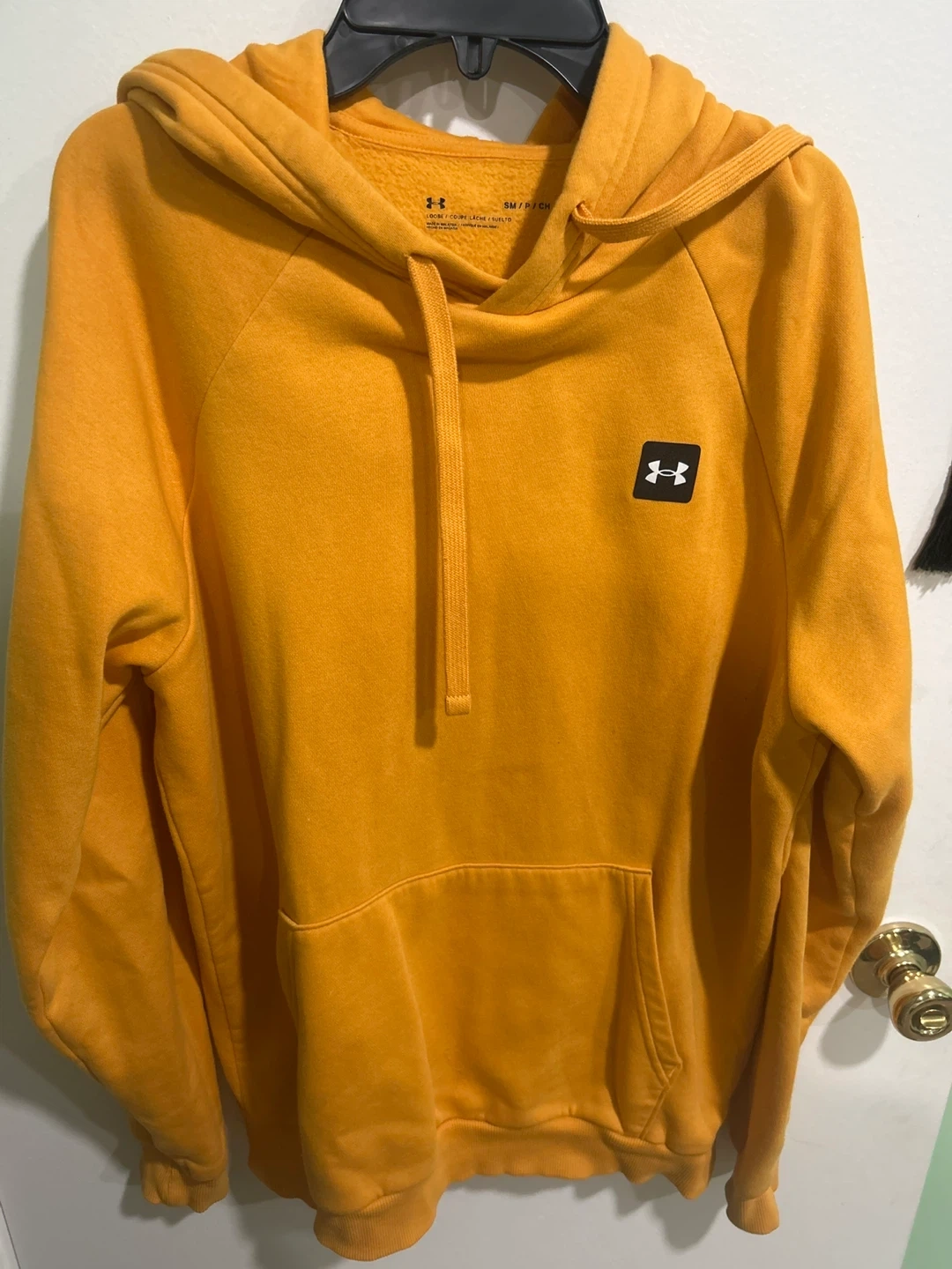 This is an Under Armour hoodie in a bright yellow color. It's a size SM/CH. There's a small stain on the front, as shown in the image. It's a comfortable pullover style with a front pocket.