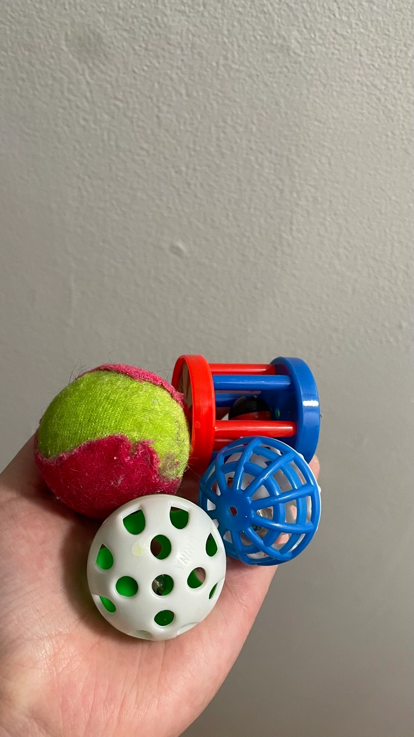 Used collection of cat toys, includes a tennis ball, and three bell plastic balls. My cat loved these, but the bells made a lot of noise.