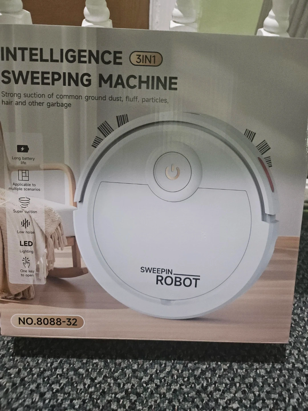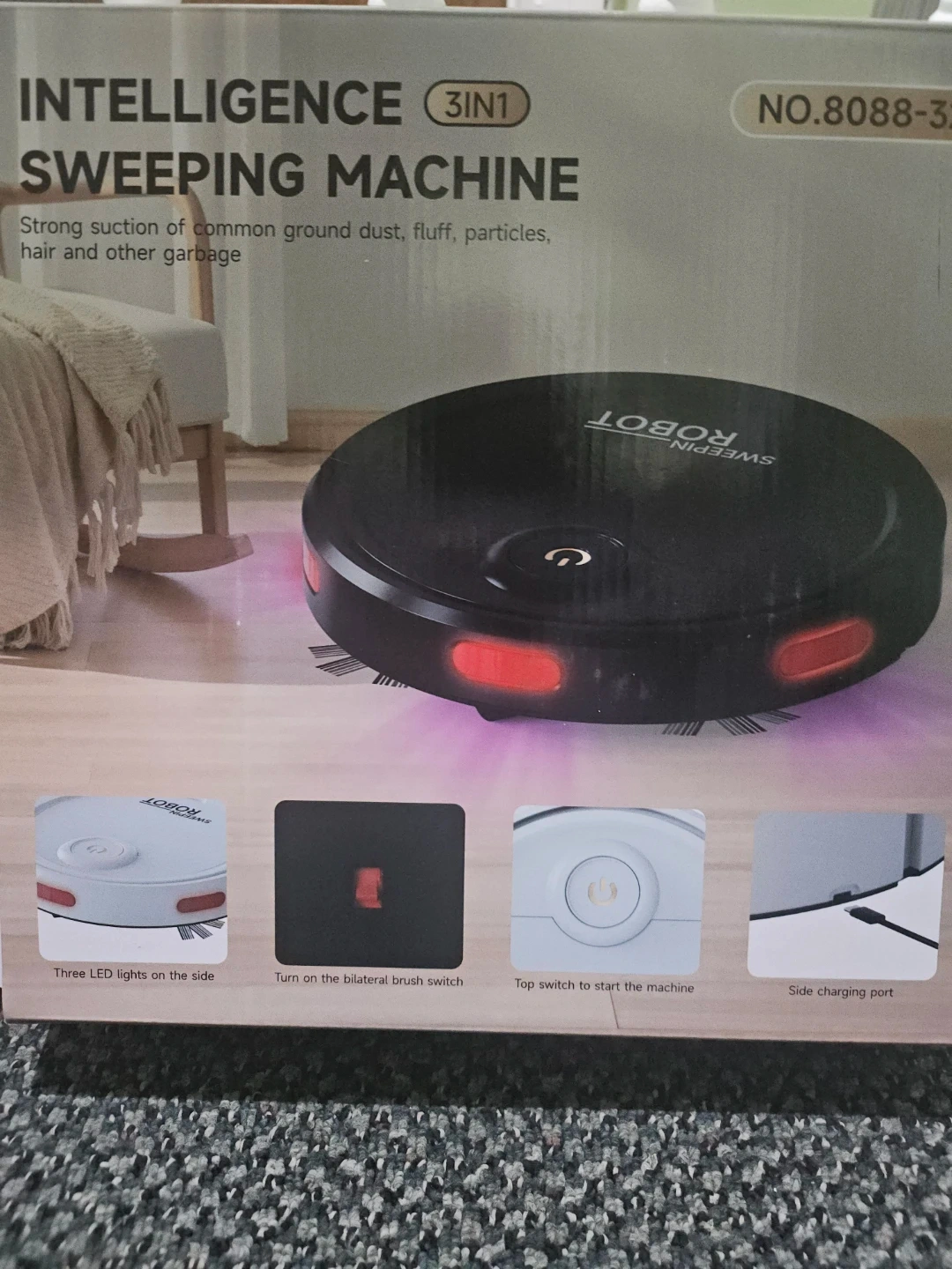 This is a 3IN1 intelligence sweeping machine robot. It has strong suction for common ground dust, fluff, particles, and hair. The product specification is 320x320x68mm, with a working voltage of 3.7V/1800mAh and a 90min charging time. It's suitable for sweeping, mopping, and vacuuming.