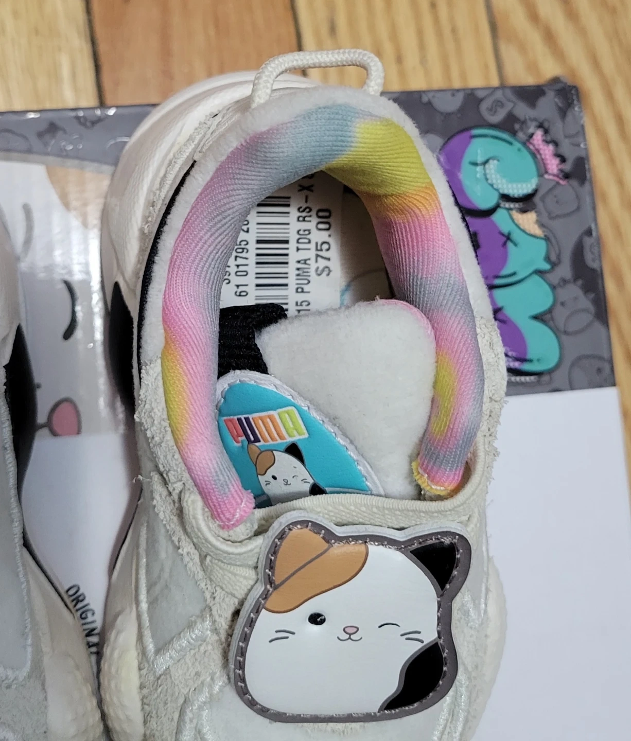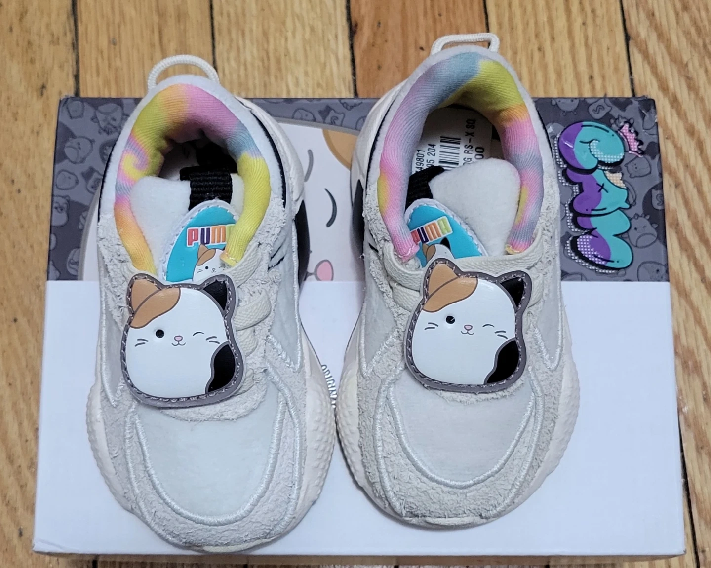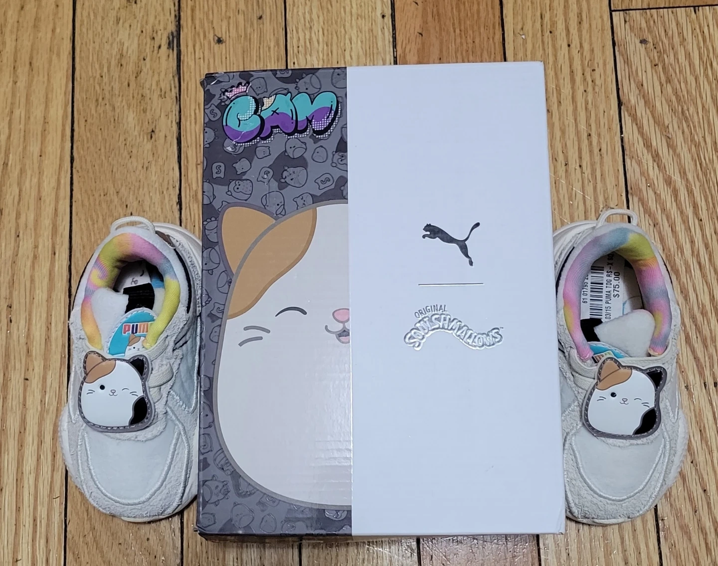 These are white Puma x Squishmallows sneakers featuring Cam the Cat. They come with the original box and have a colorful lining. Size is 4.5 US Toddler.