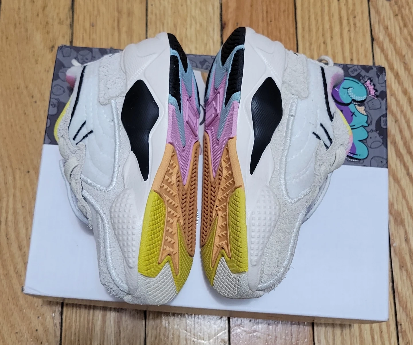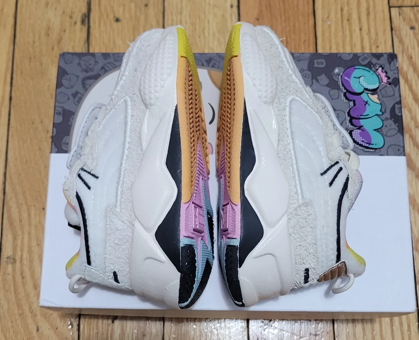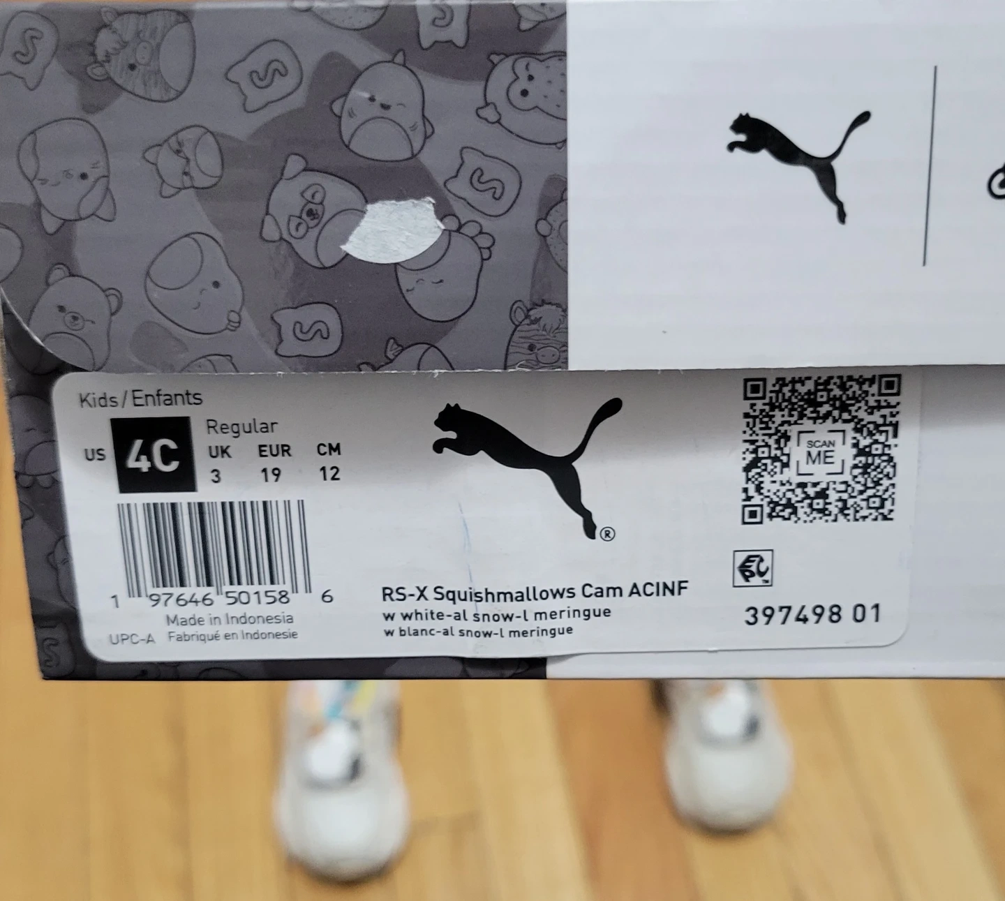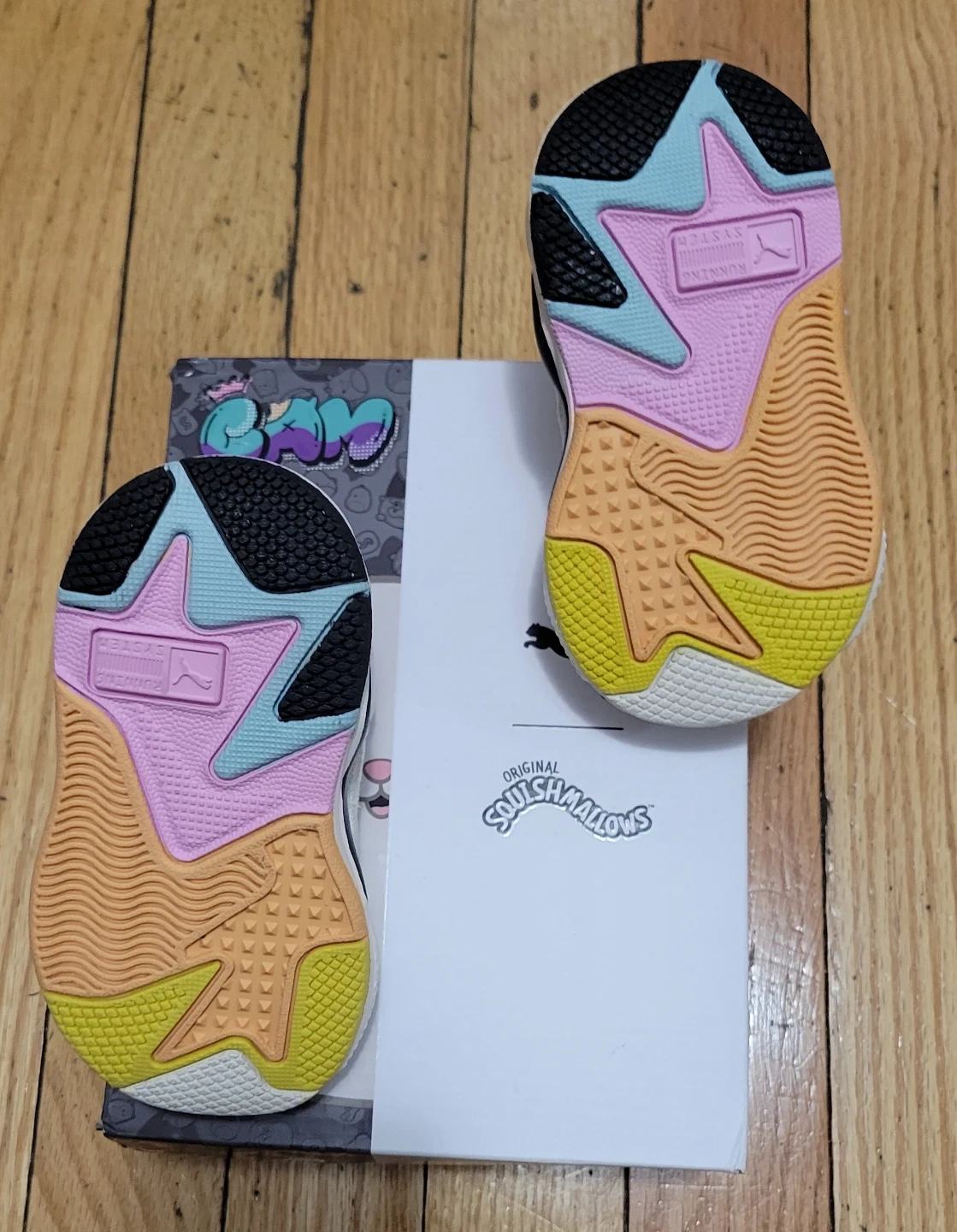 These are white Puma x Squishmallows sneakers featuring Cam the Cat. They come with the original box and have a colorful lining. Size is 4.5 US Toddler.