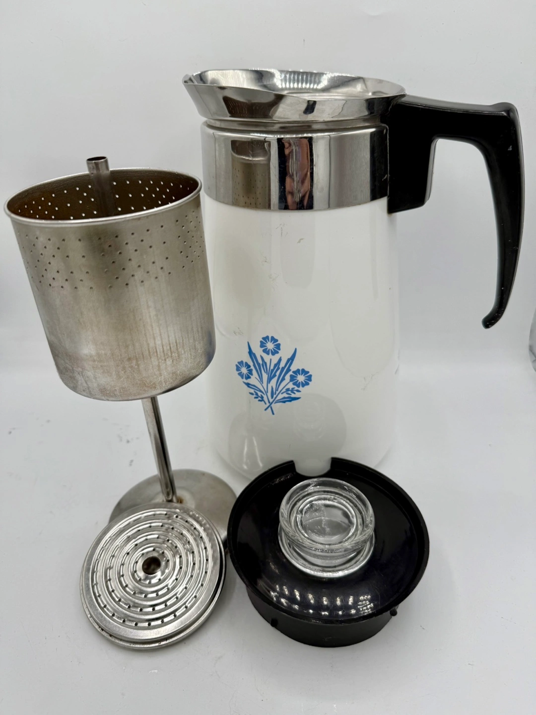 Vintage Corning Ware percolator coffee pot. 9 cup capacity. Blue flower design. Metal and glass components. Shows some wear.