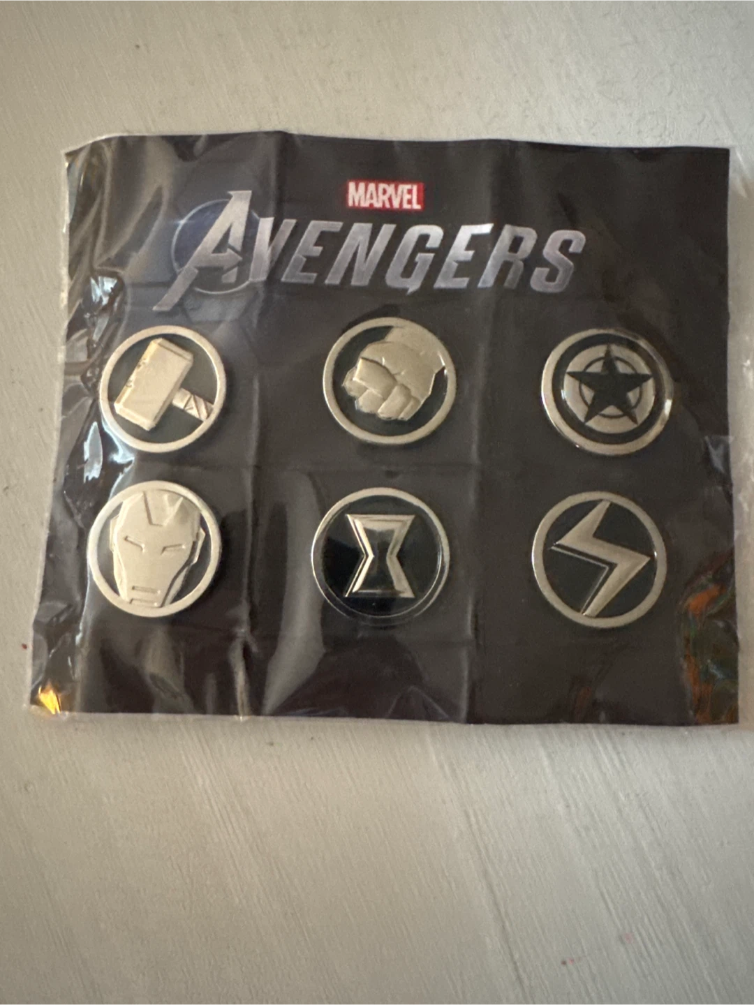 Selling a brand new Marvel Avengers pin set! This set includes six pins featuring iconic symbols: Thor's hammer, Hulk's fist, Captain America's star, Iron Man's mask, Black Widow's hourglass, and a lightning bolt. Perfect for any Marvel fan!