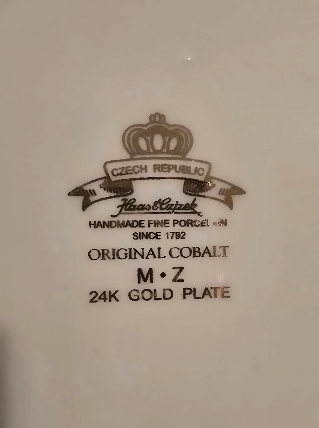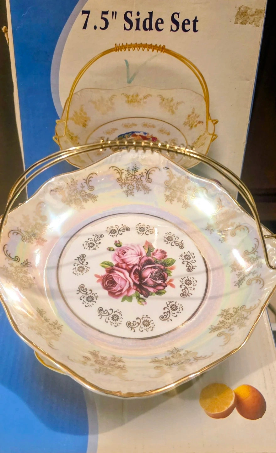 This Haas & Czjzek dish is from the Czech Republic, handmade fine porcelain since 1792. It features original cobalt and 24K gold plate detailing. The dish has a floral design with roses and a pearlescent finish. It's a 7.5" side set. This would be useful for serving small dishes or as a decorative piece.