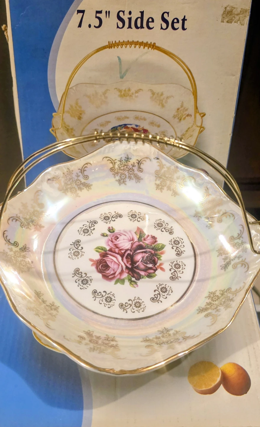 This Haas & Czjzek dish is from the Czech Republic, handmade fine porcelain since 1792. It features original cobalt and 24K gold plate detailing. The dish has a floral design with roses and a pearlescent finish. It's a 7.5" side set. This would be useful for serving small dishes or as a decorative piece.