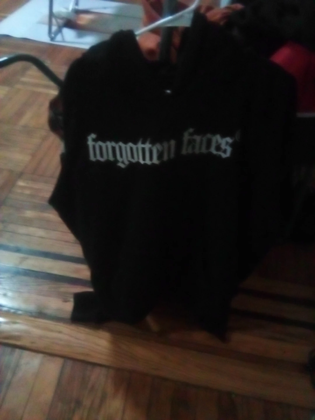Black hoodie with 'forgotten faces' graphic. Cotton material. Size is not visible.