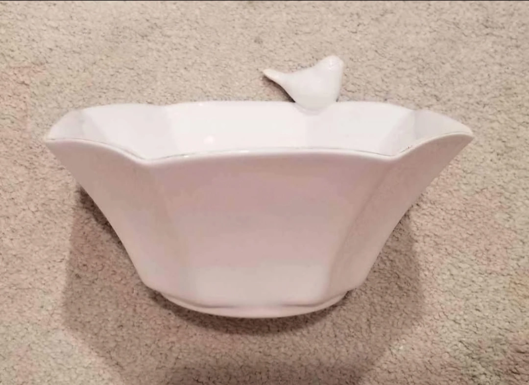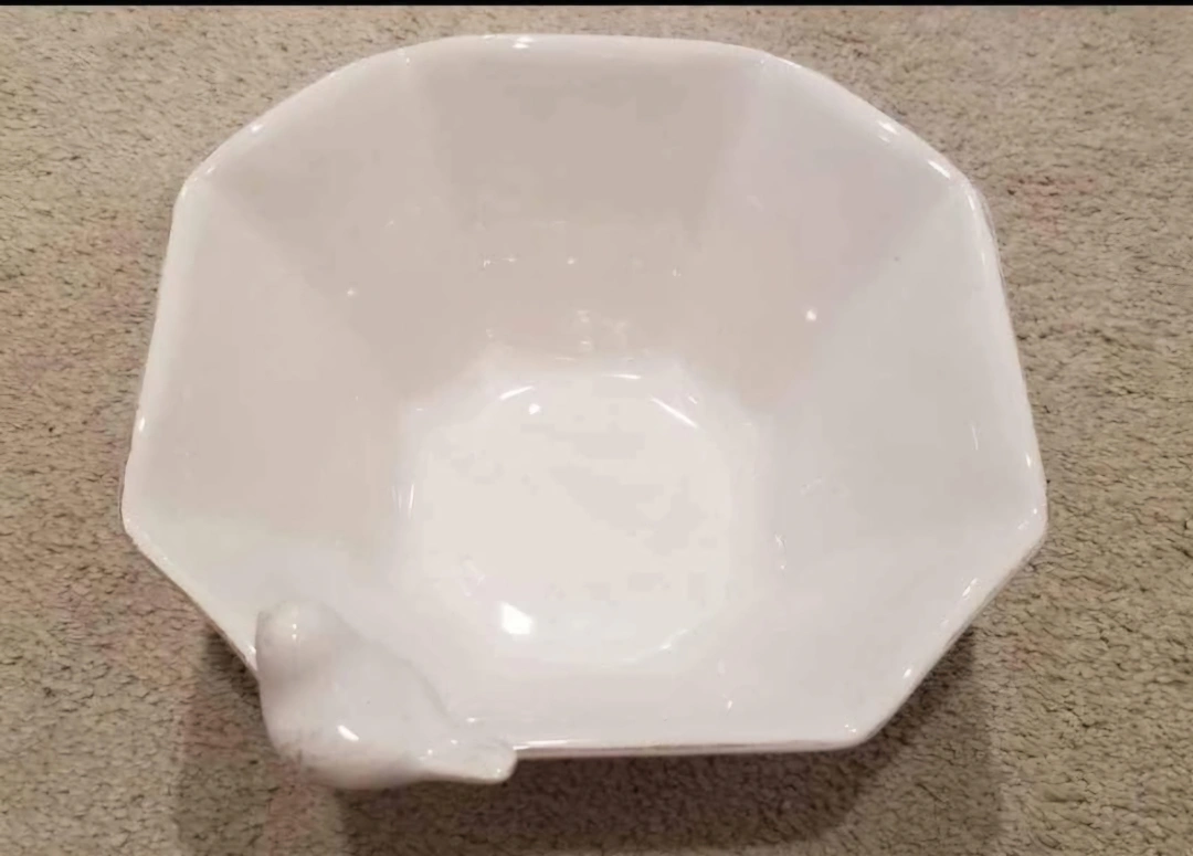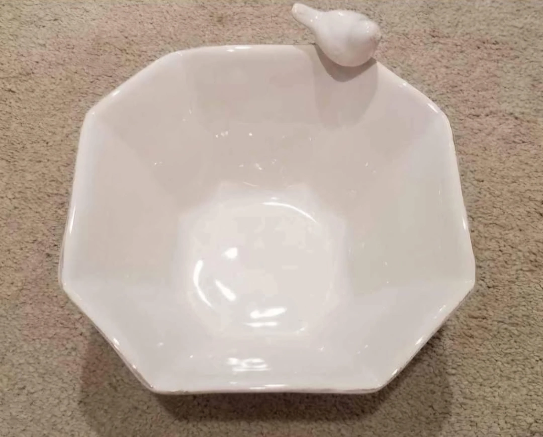 Octagonal white ceramic bowl. Features a small bird figurine. Perfect for candy, keys, or other small items.
