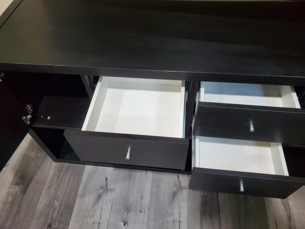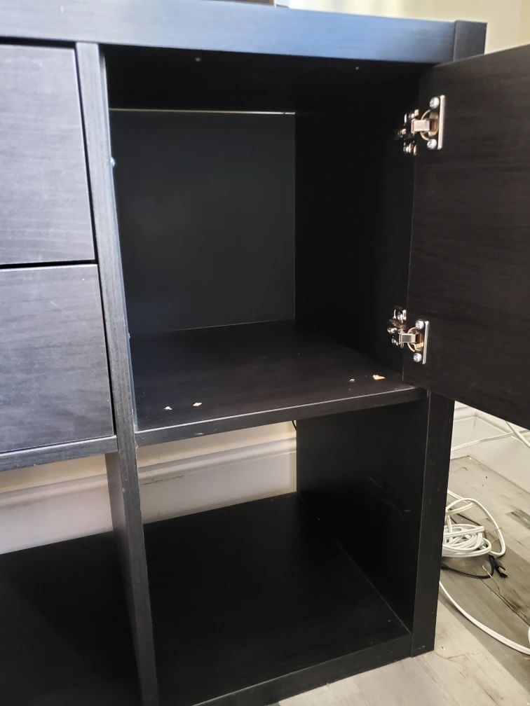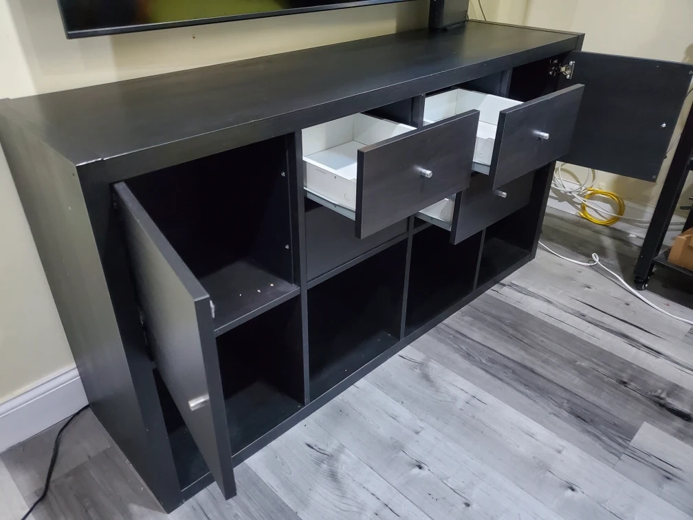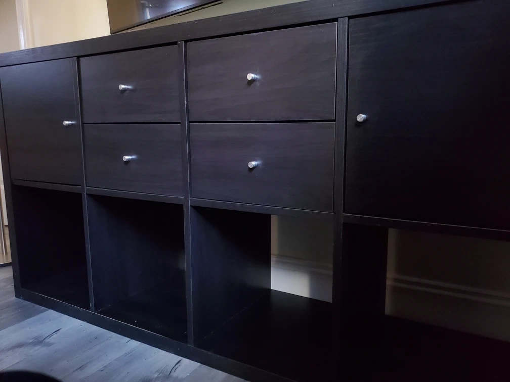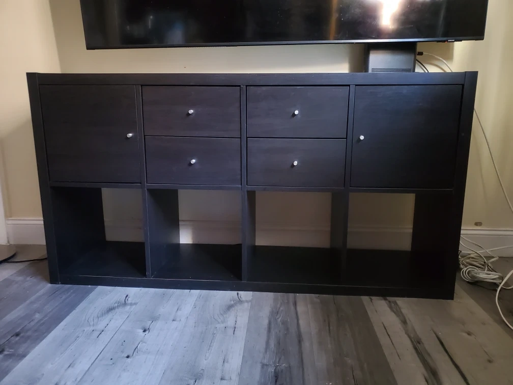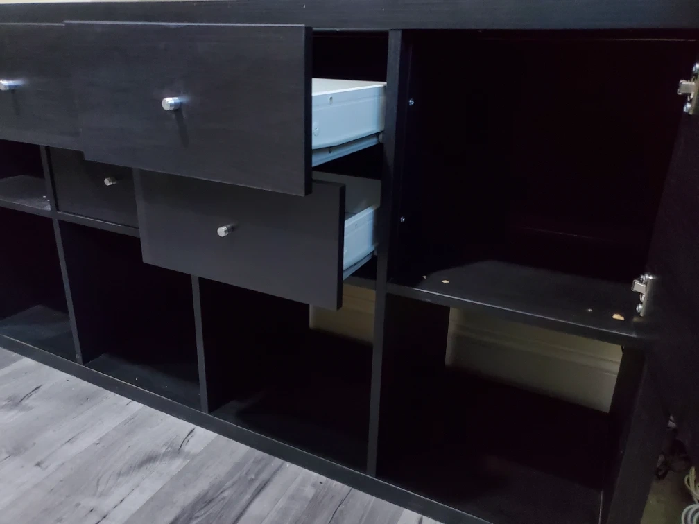 We moving out so we're selling this black IKEA Kallax shelf, it has a combination of shelves, drawers, and doors we additionally ordered from Ikea! It has some drawers installation wear as seen of photos, otherwise is in very good condition.