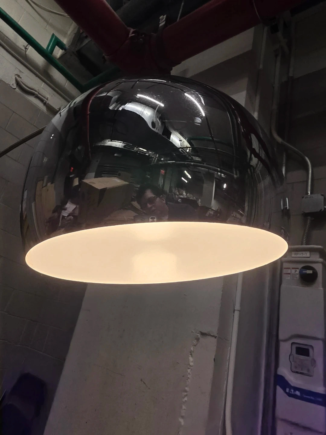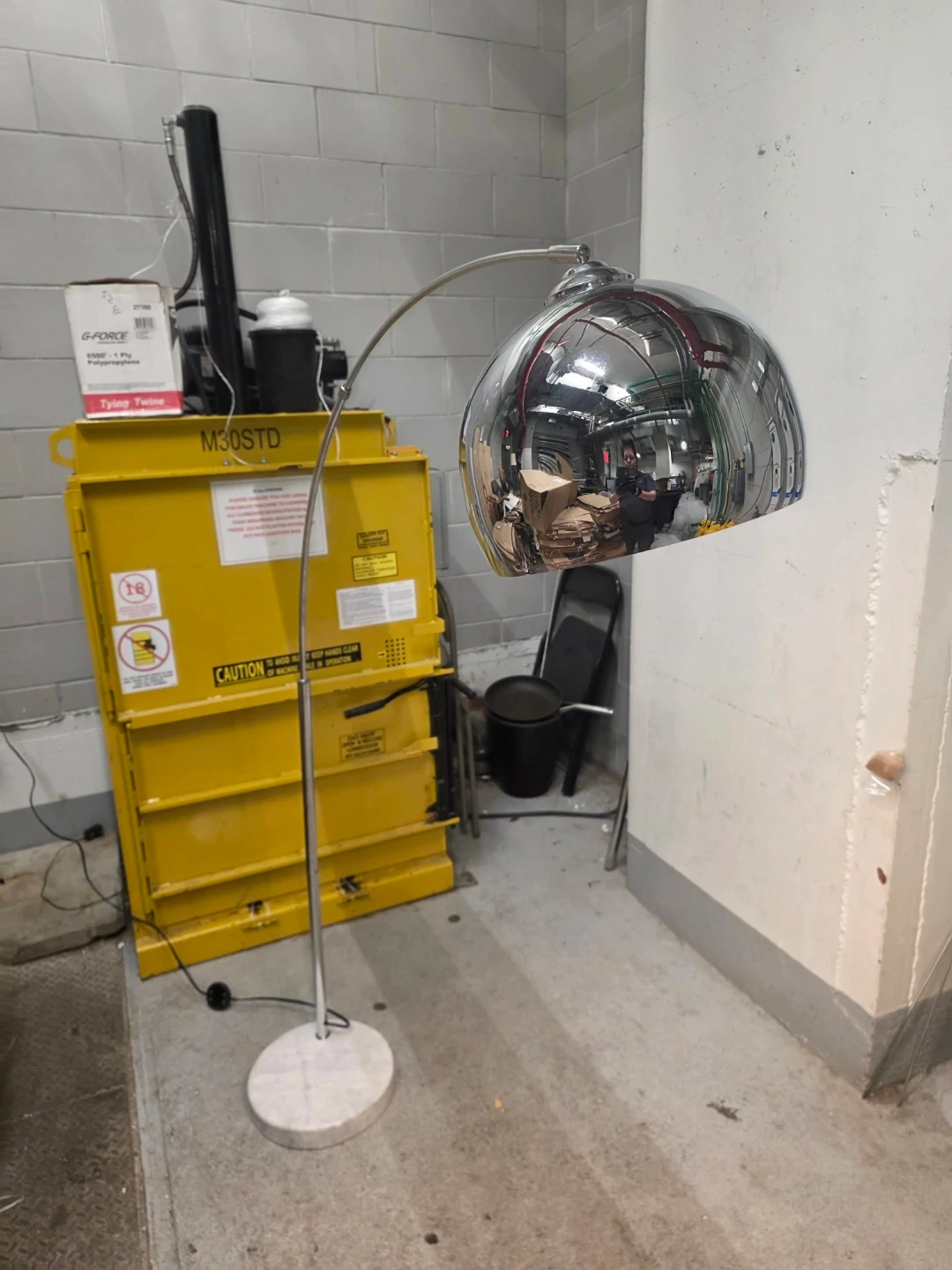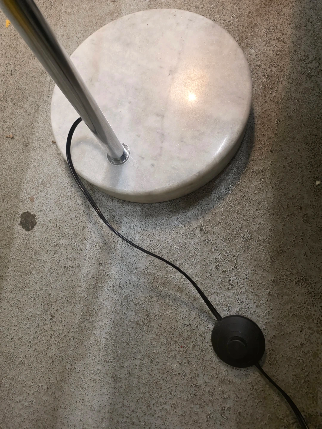 Arc floor lamp with a polished chrome shade and a white marble base. It features a foot pedal switch for easy operation. This lamp's sleek design makes it a stylish addition to any room.