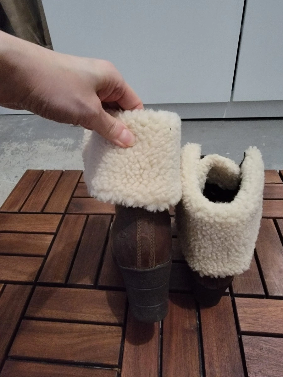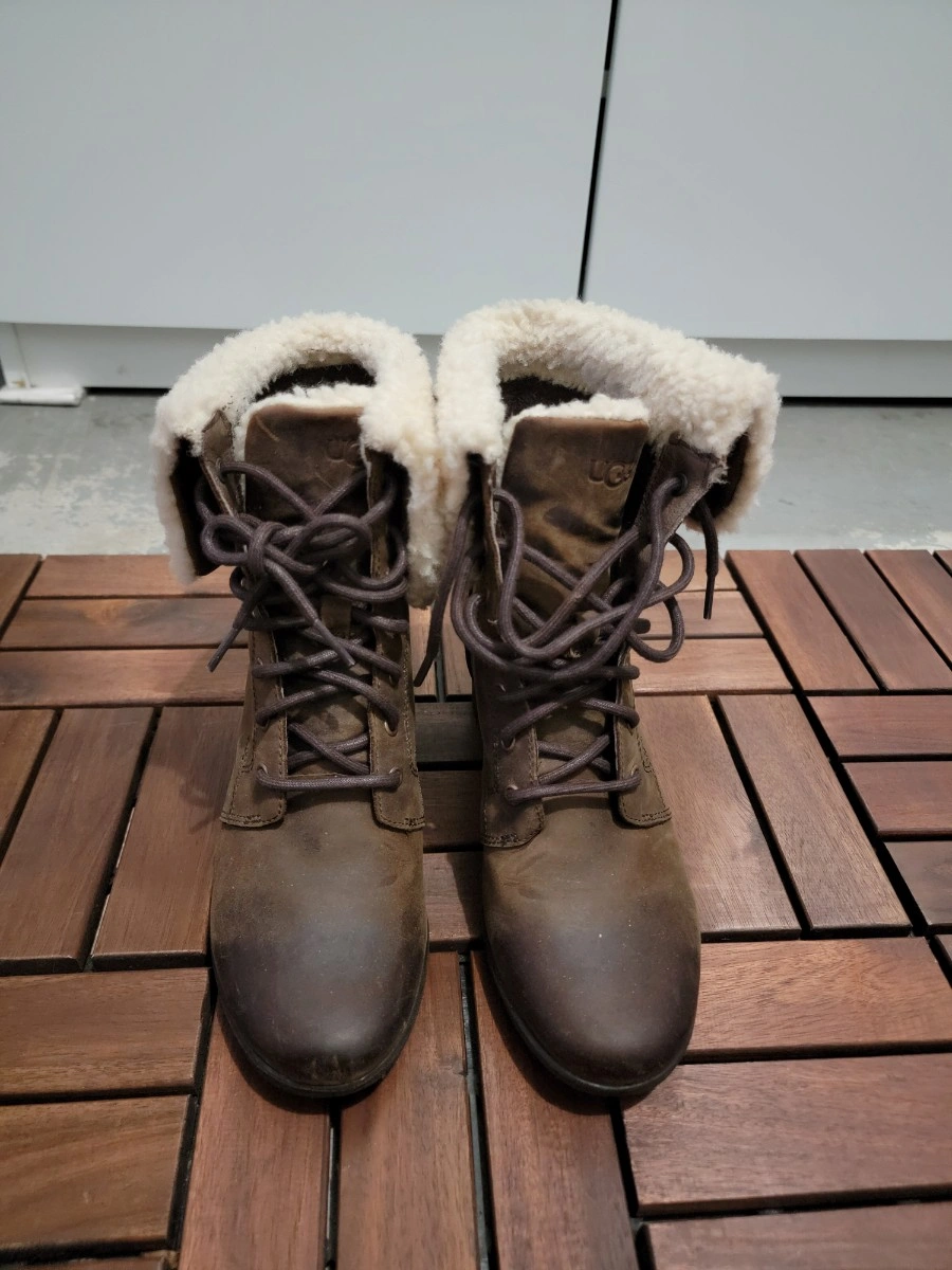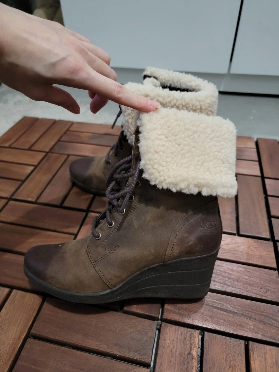 15Brown leather wedge waterproof boots. Lace-up front. Faux fur trim around top. Wedge heel. Good for fall and winter.