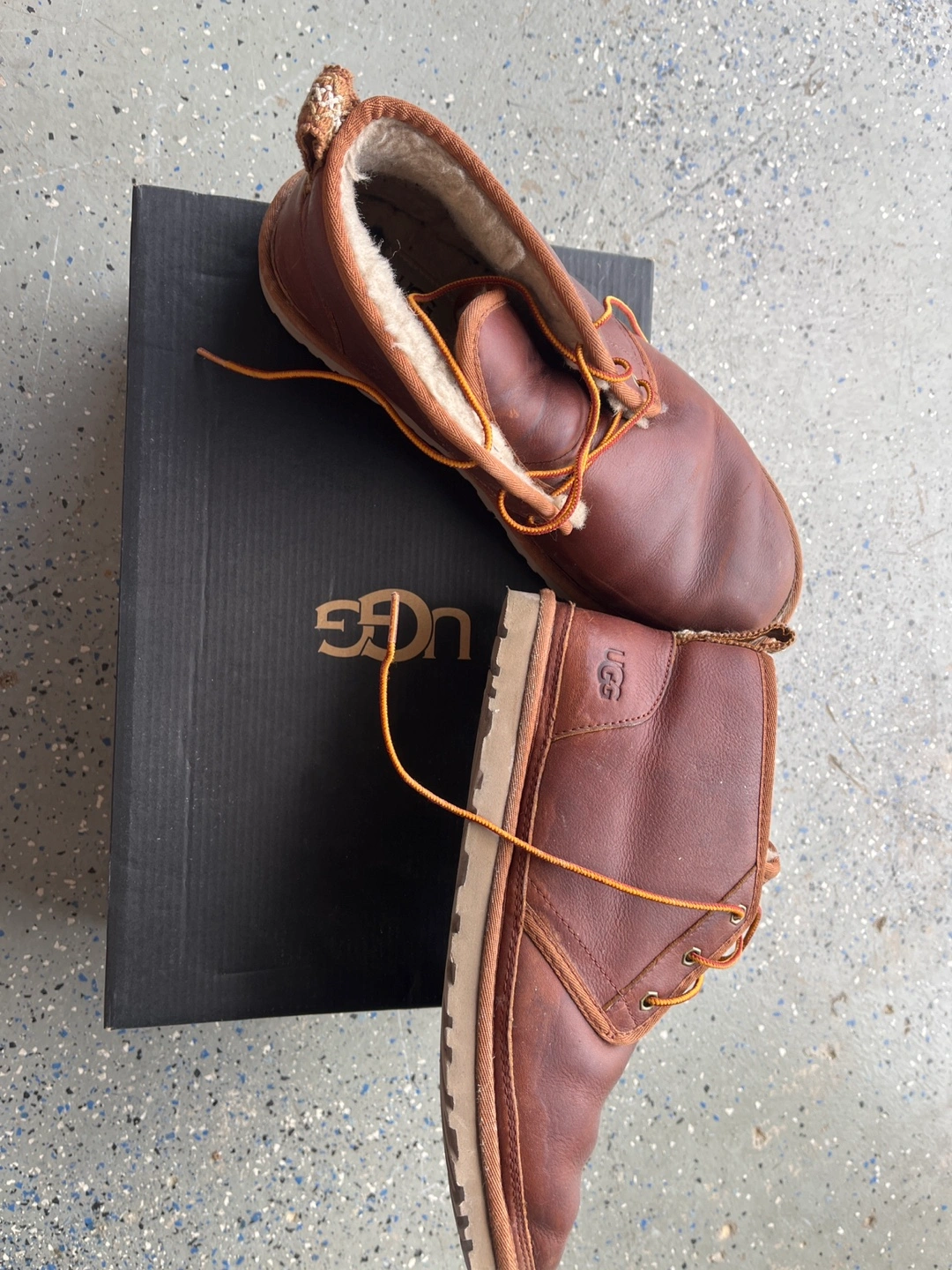 Selling a pair of UGG brown leather chukka boots. They come with the original box. These boots are in good condition and ready for a new home!