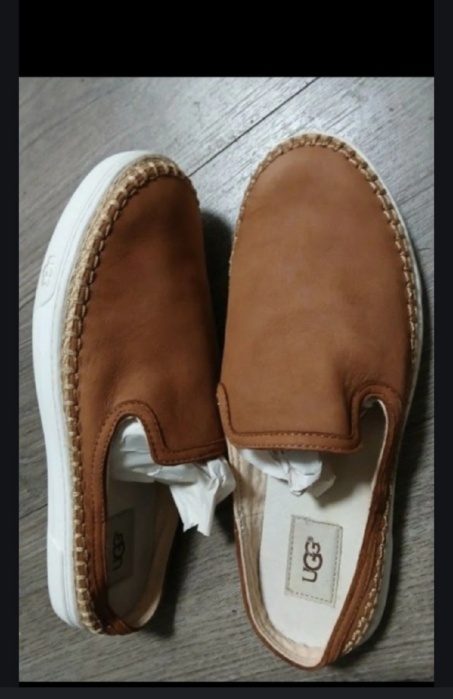 Here are some UGG slip-on shoes with a brown leather upper and espadrille detailing. They look to be in great condition!