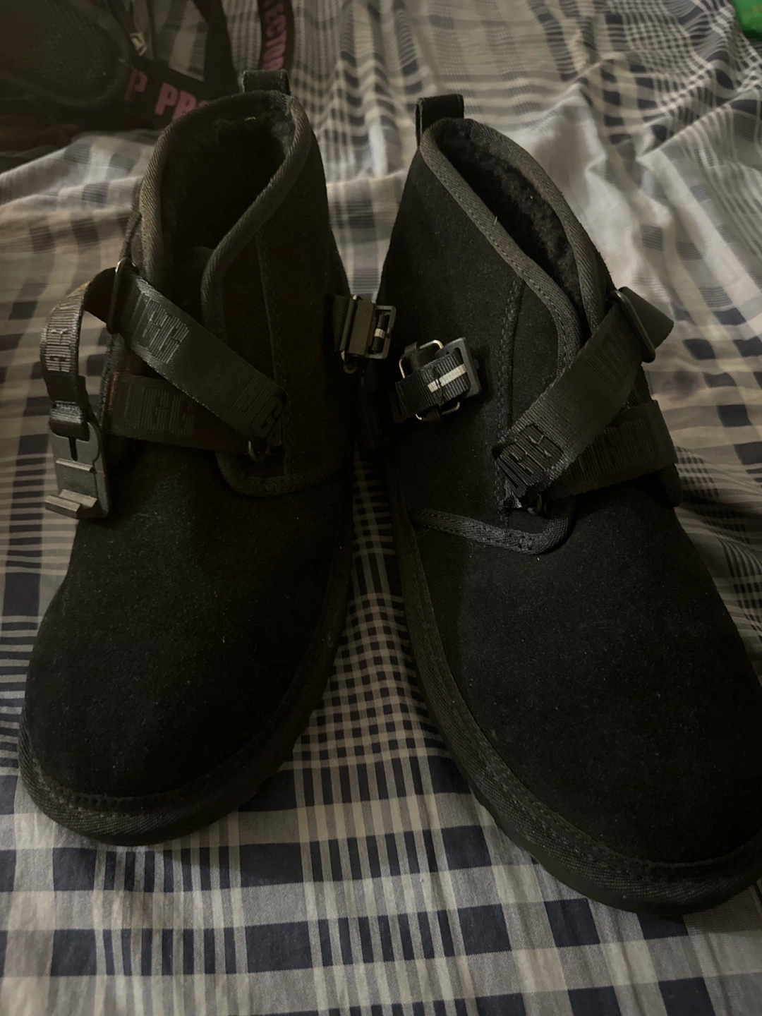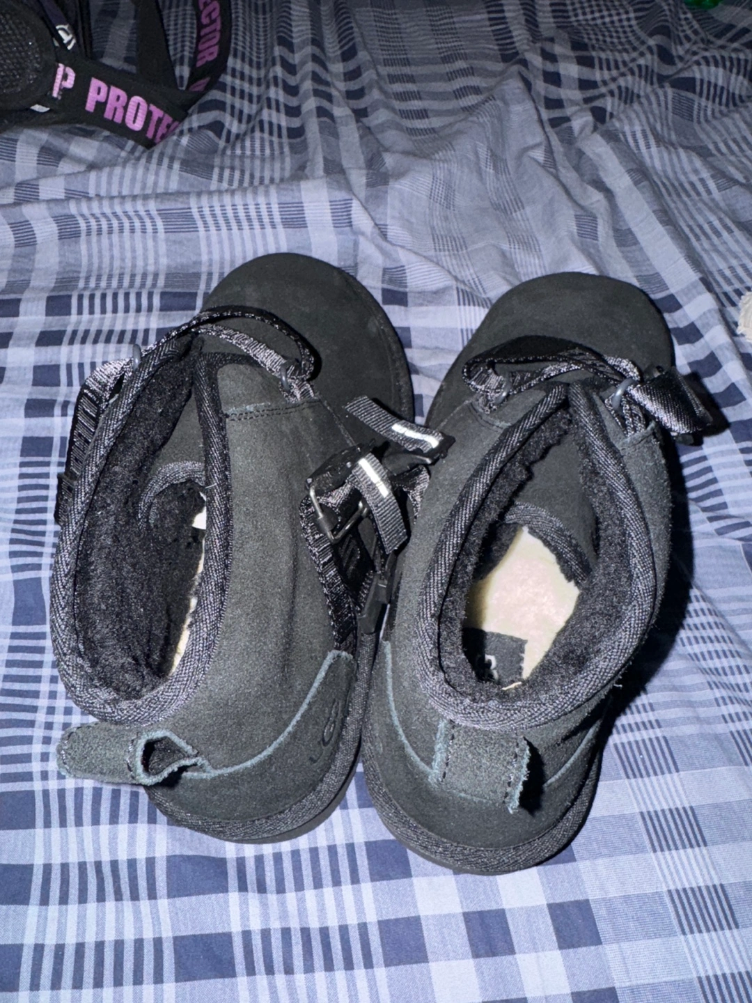 Black suede boots with buckle accents. Faux fur lining.