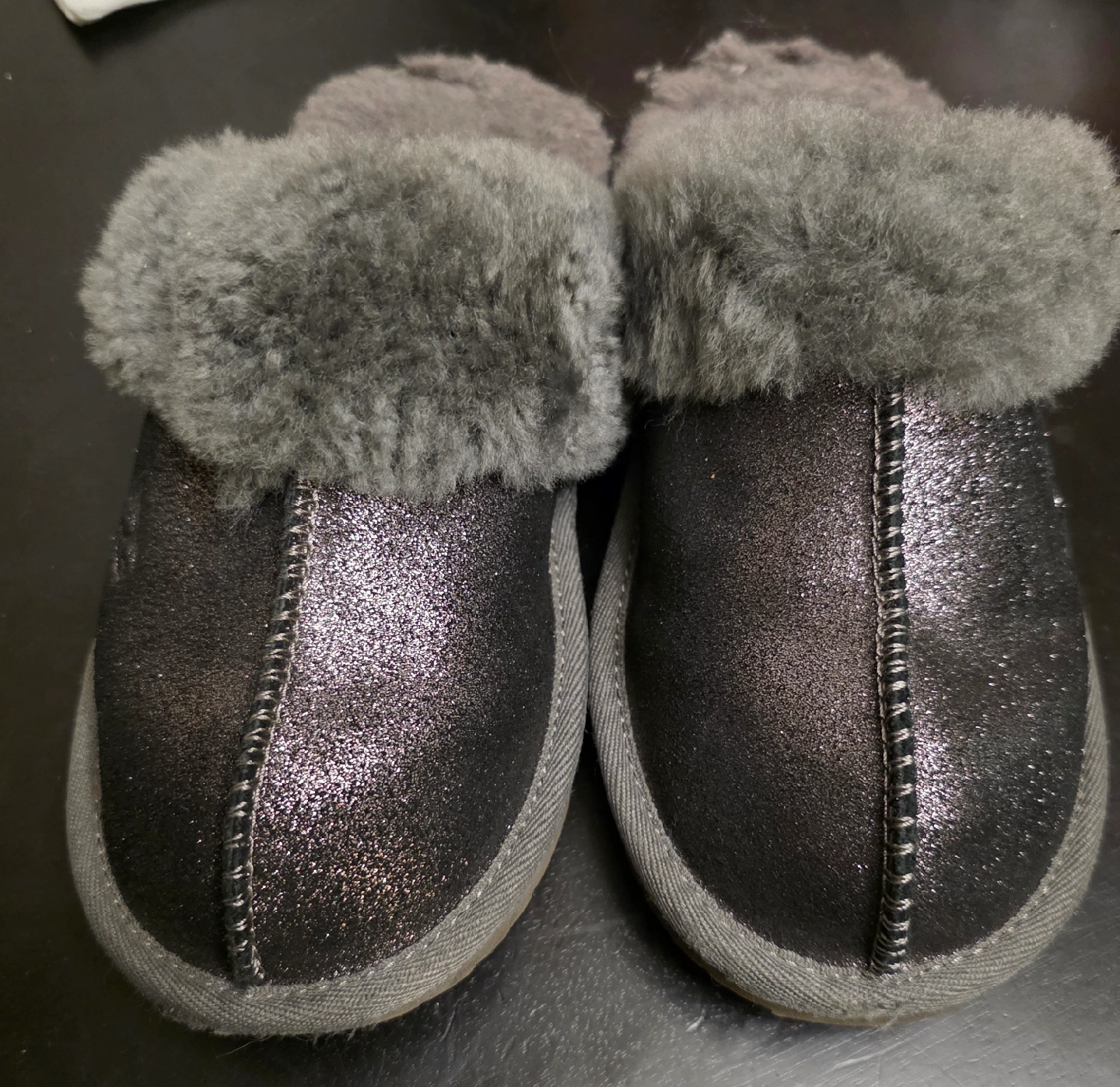 10UGG Cozy II Metallic Glitter Slipper Youth Big Kid Grey Metallic Size 2 Selling a pair of UGG children's slippers. The size is US 2, UK 1, EU 33.5, and Japan 21. They are soft and in great condition, ready to keep an new pair of feet warm.