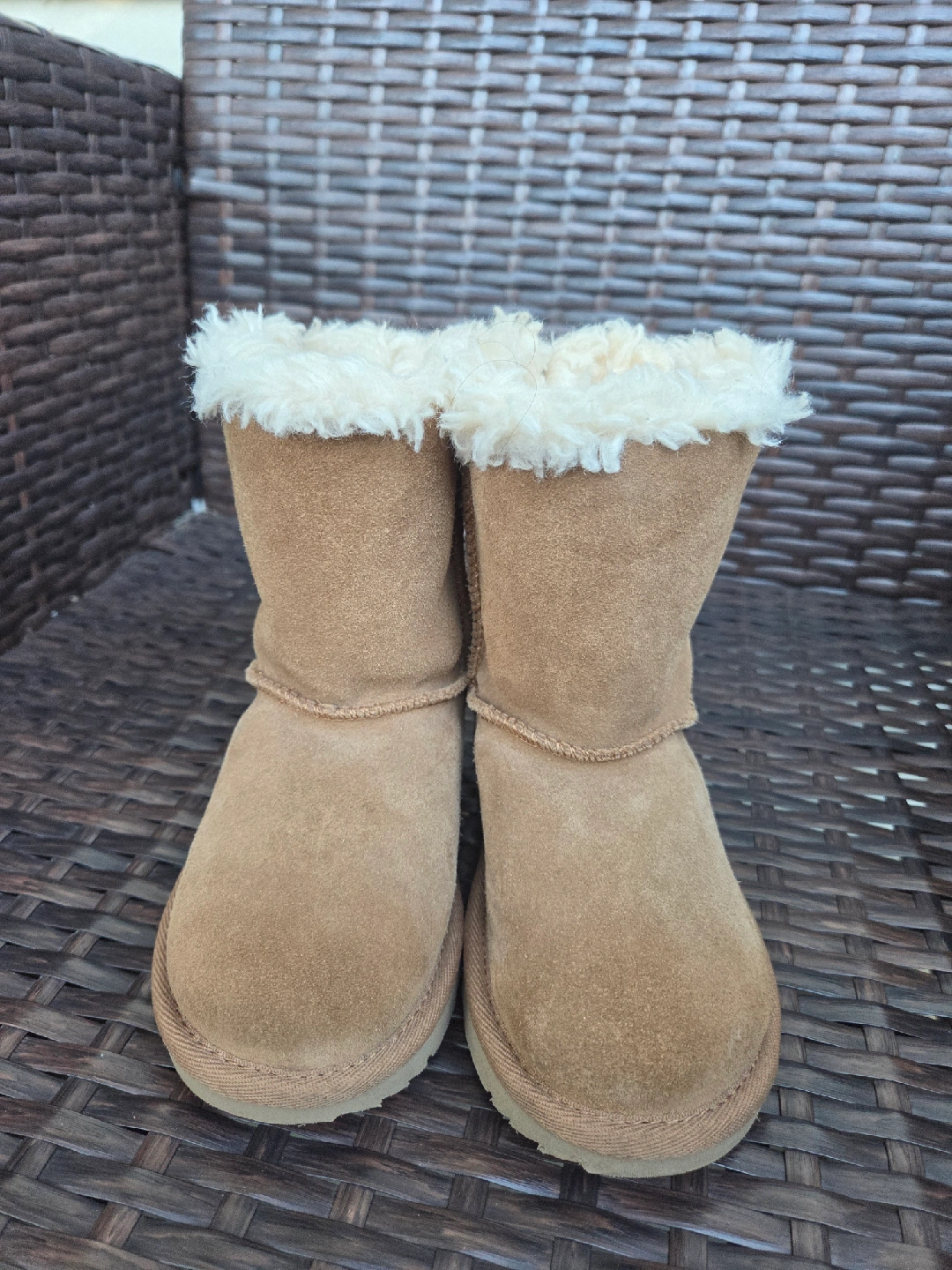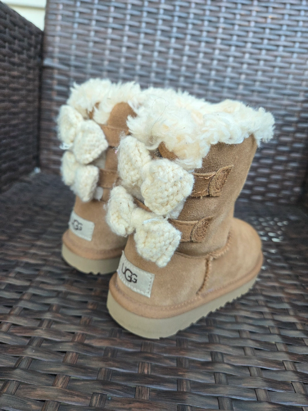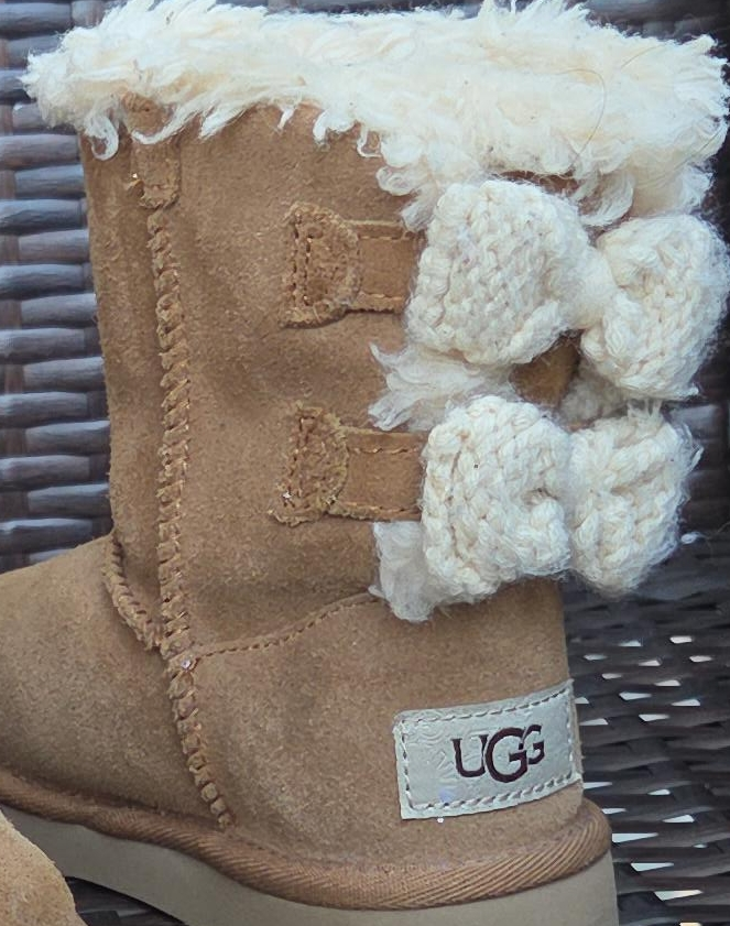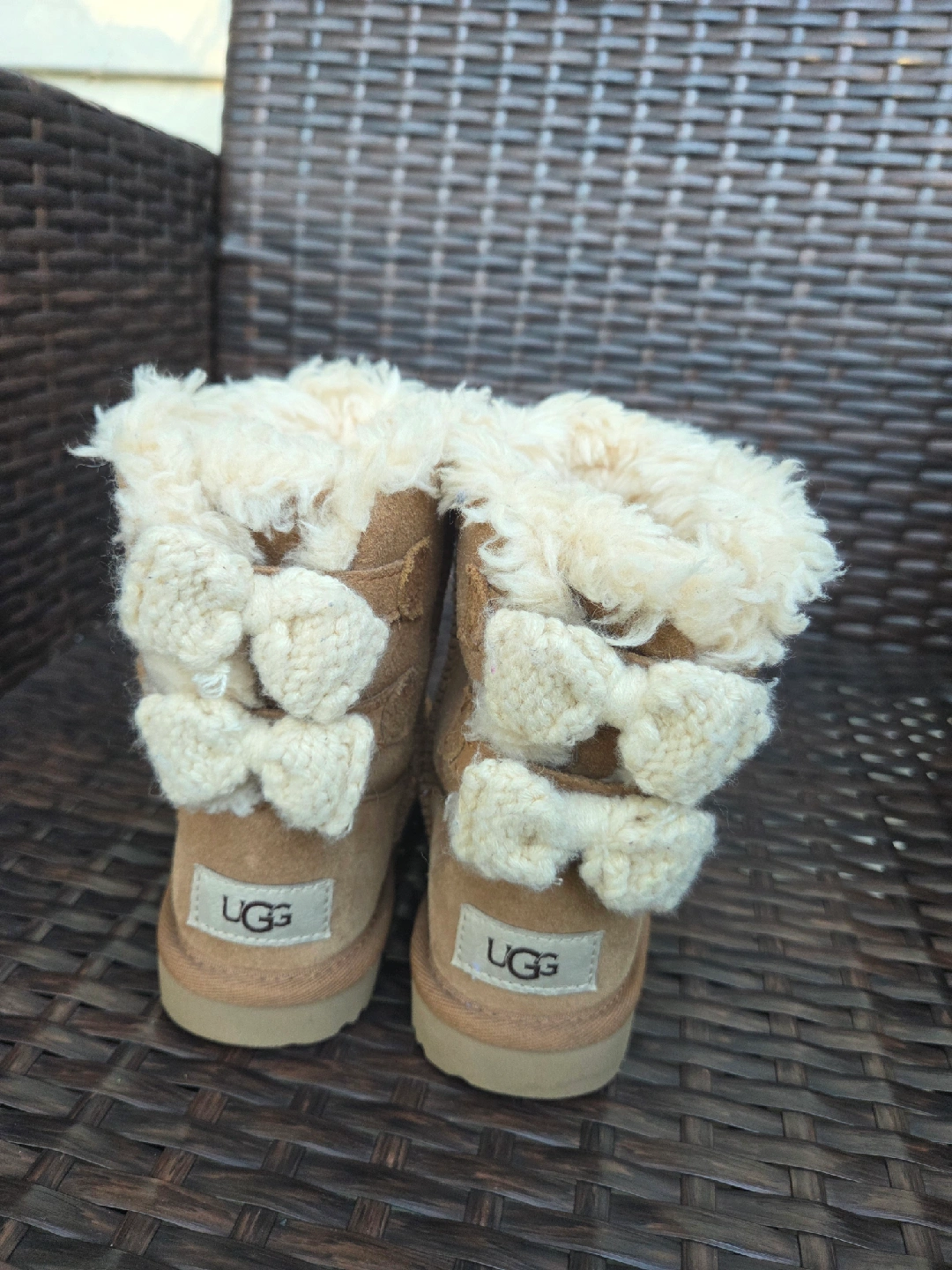 These UGG kids' boots are a cute and cozy choice for your little one! They feature a tan suede exterior, soft fur trim, and adorable knit bows on the sides. Perfect for keeping little feet warm and stylish!