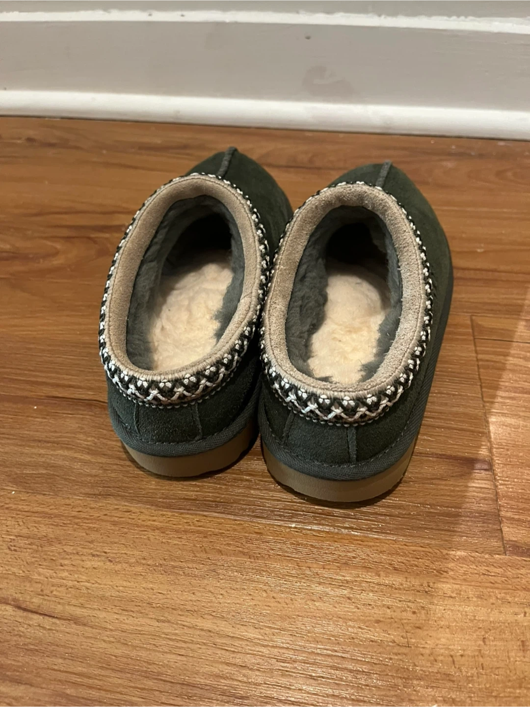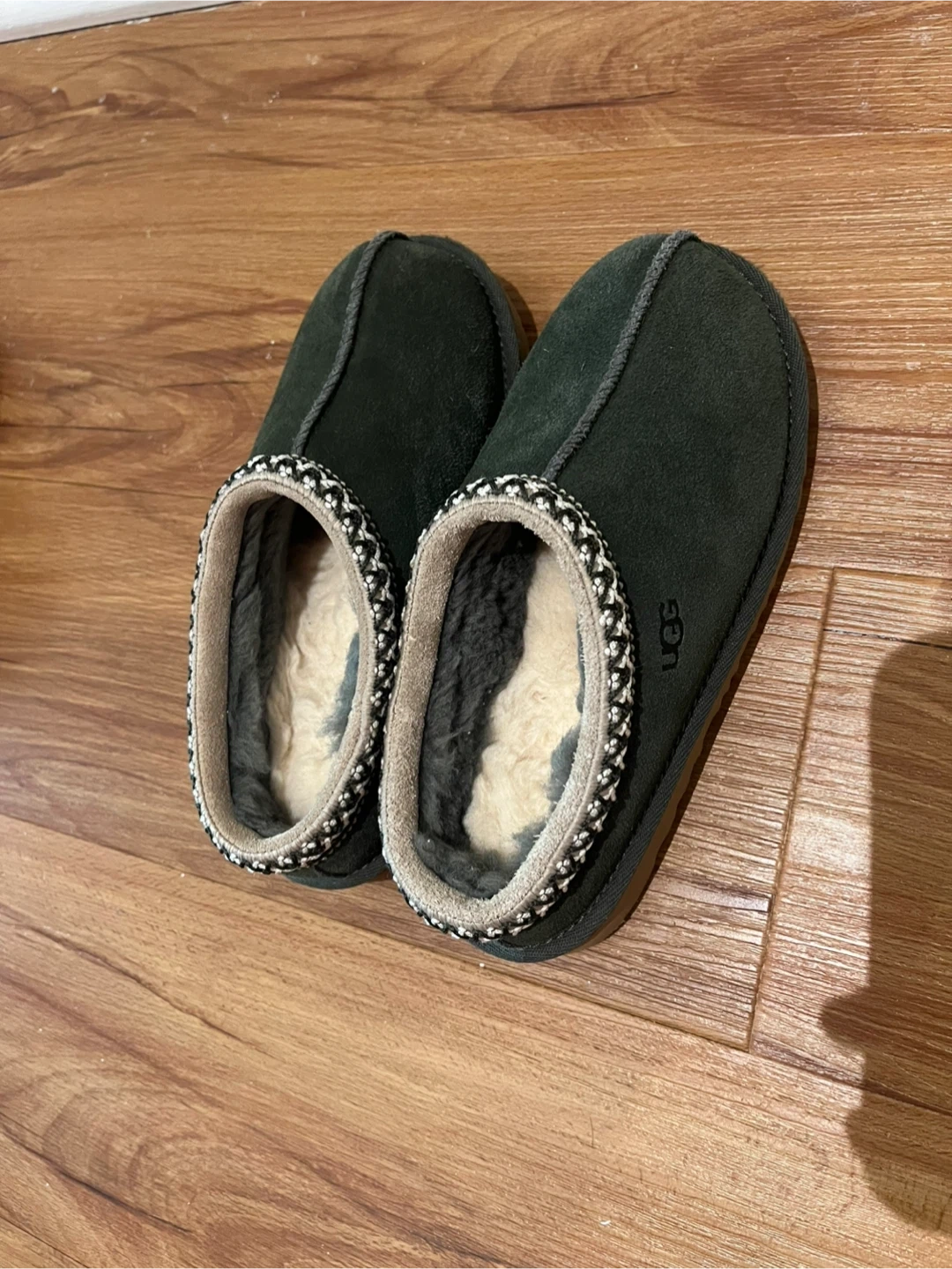 Cozy UGG Tasman slippers in a women's size 13K! These are in olive green and feature a decorative braid around the opening. Perfect for keeping your feet warm. I purchased these from the official store and have only worn them twice. They’re in excellent, like-new condition, though the inner tag has been removed and the original box is not included.