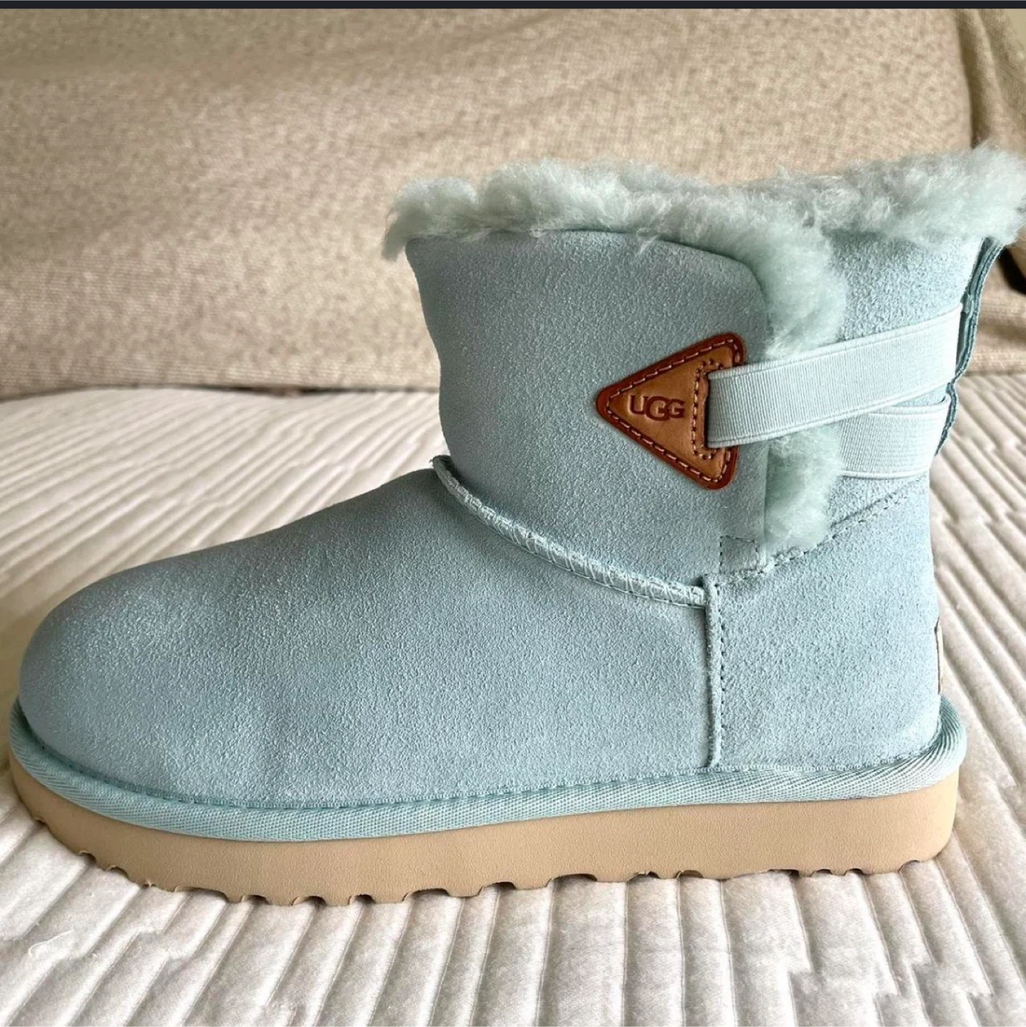 60These UGG Mini Bailey Bow II boots are in great condition. They are a beautiful shade of blue and size 9. Perfect for keeping your feet warm and stylish!