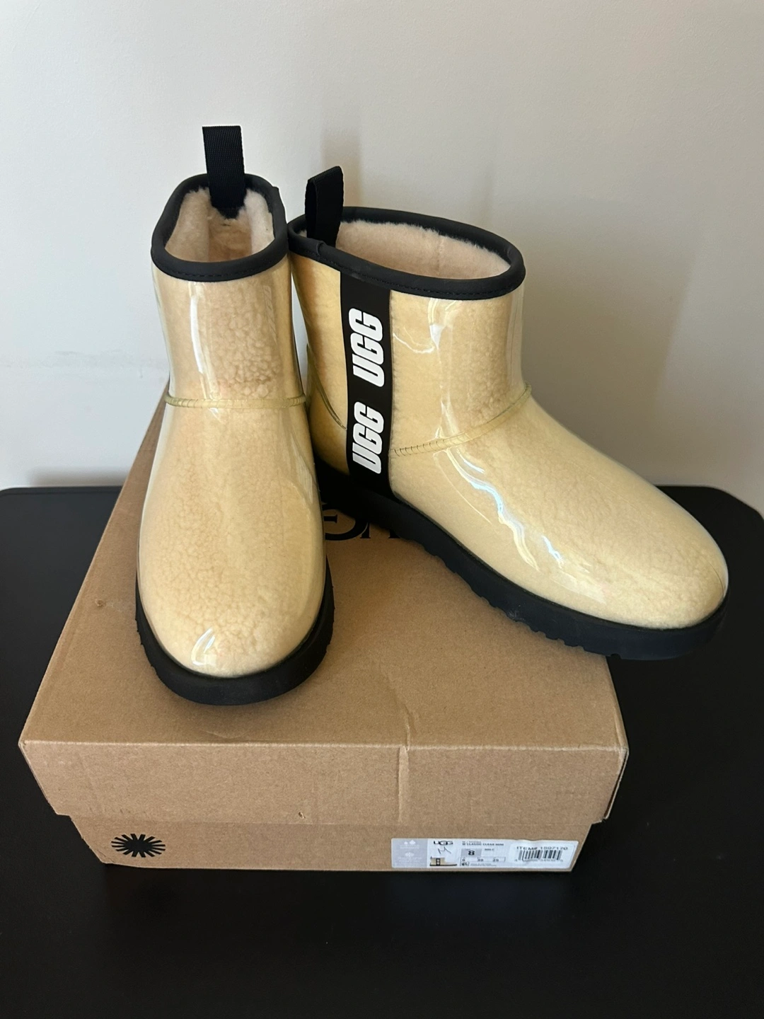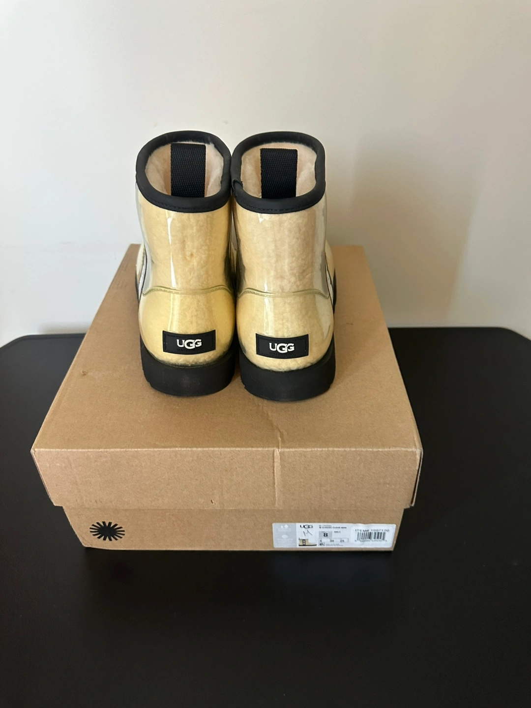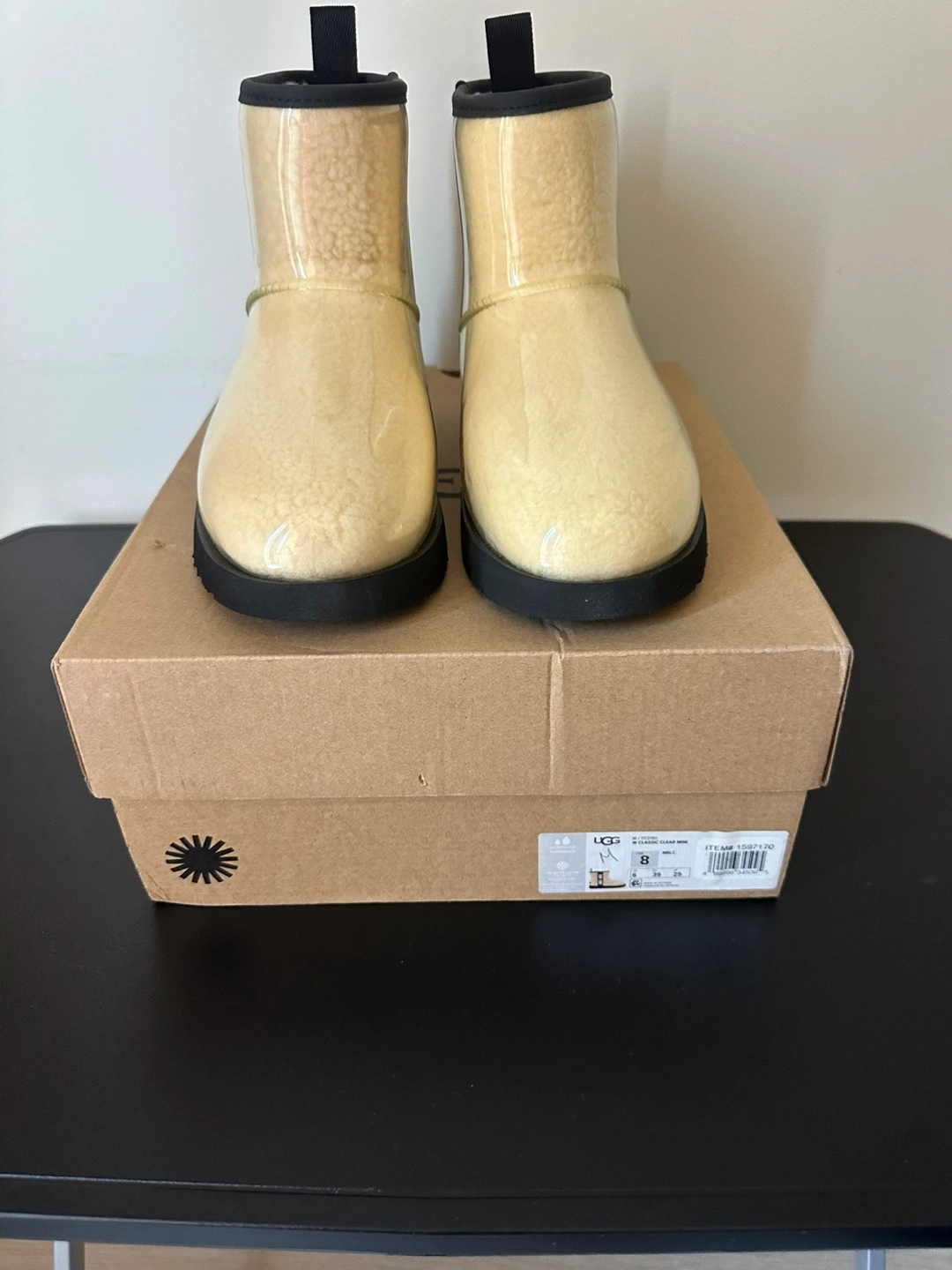 16Adorable UGG Neumel Clear Mini boots. Size 8. Clear PVC upper, plush sheepskin lining. Black sole. Comes in original box.