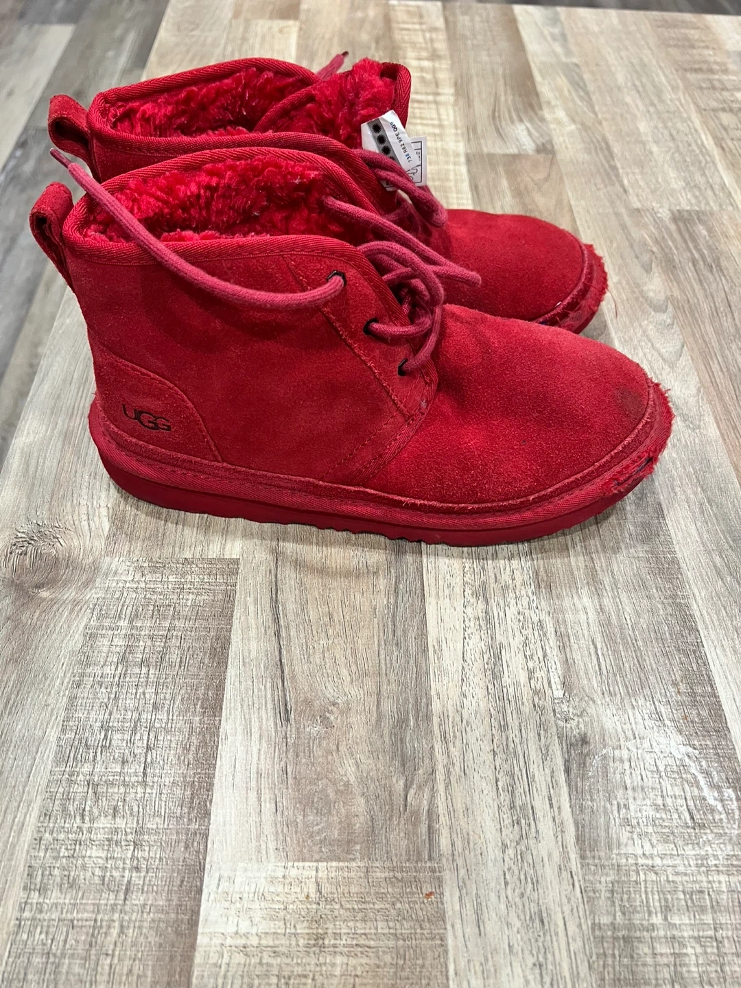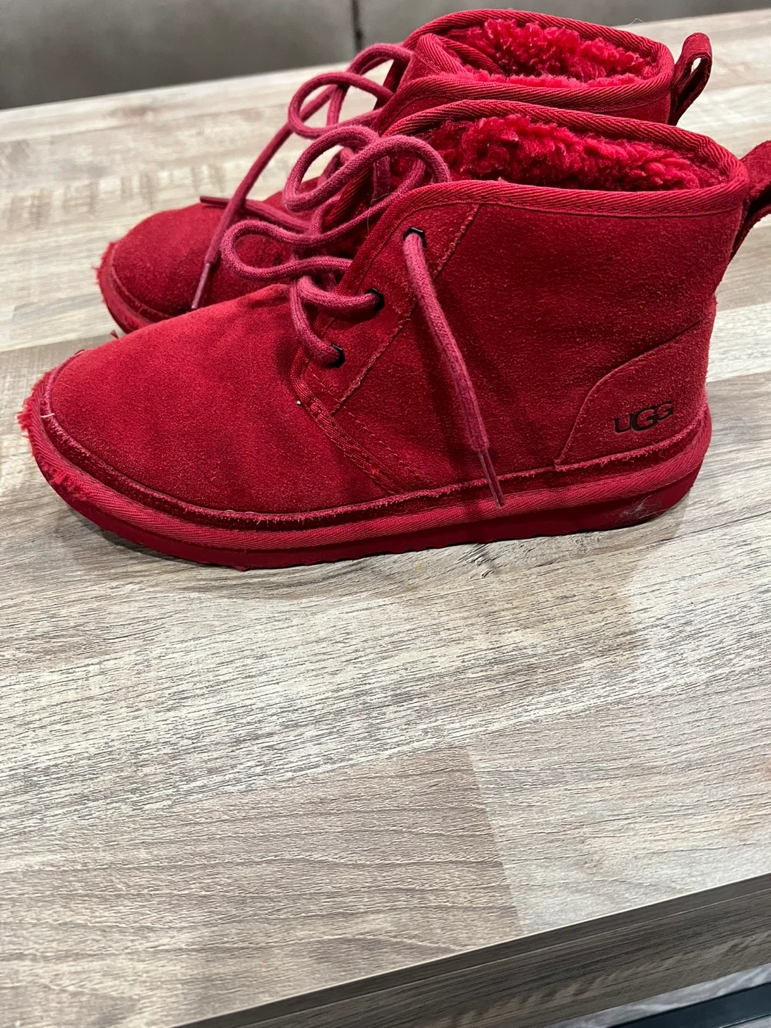60UGG chukka boots in red suede. They're in used condition, but still have lots of life left! Perfect for adding a pop of color to your outfit and keeping your feet cozy. Youth size 6Y: Women's size 7.5