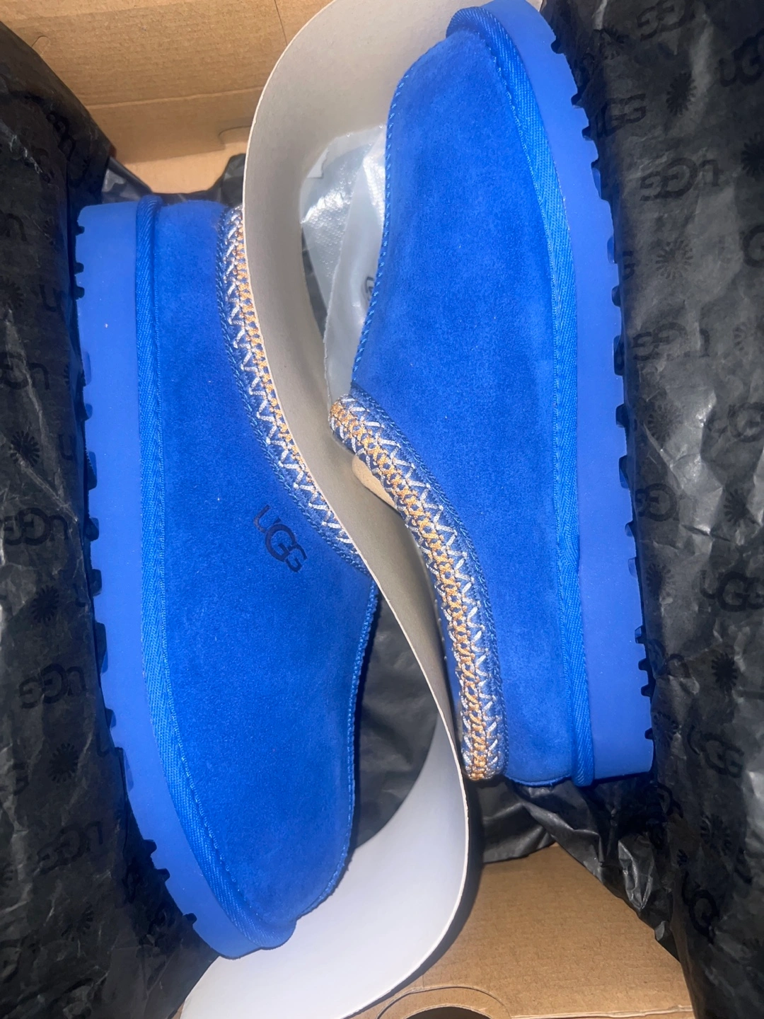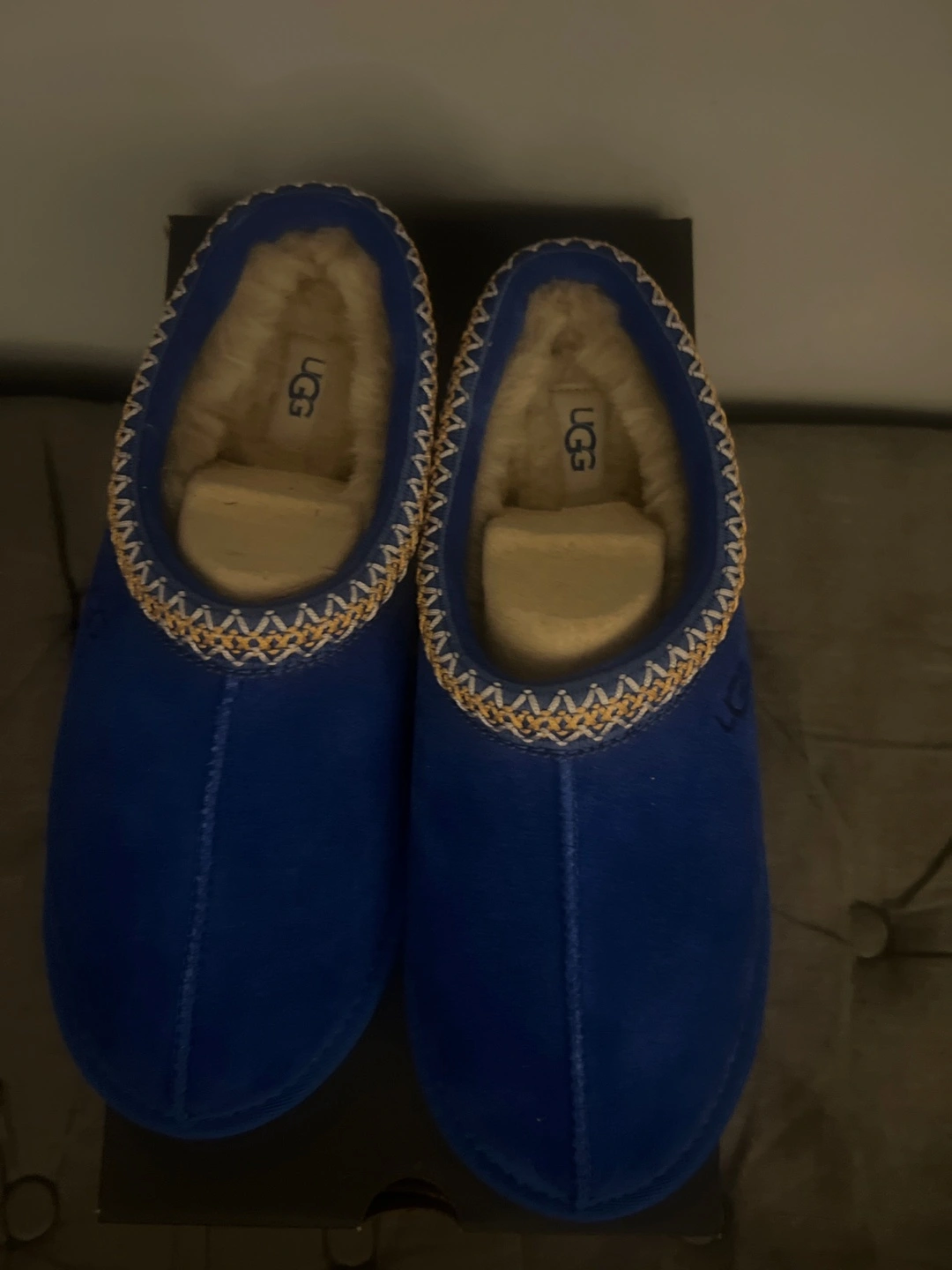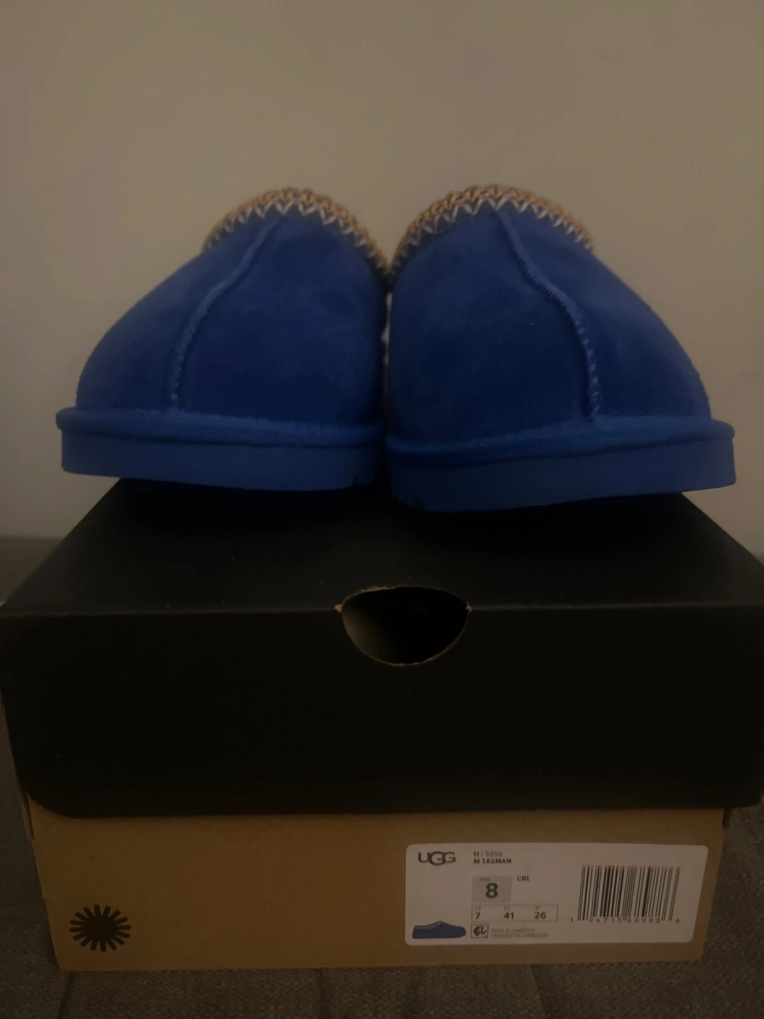 Selling a pair of UGG Tasman slippers in a vibrant blue color! They are new and come with the original box. The slippers are a size 8. Perfect for keeping your feet cozy and stylish!