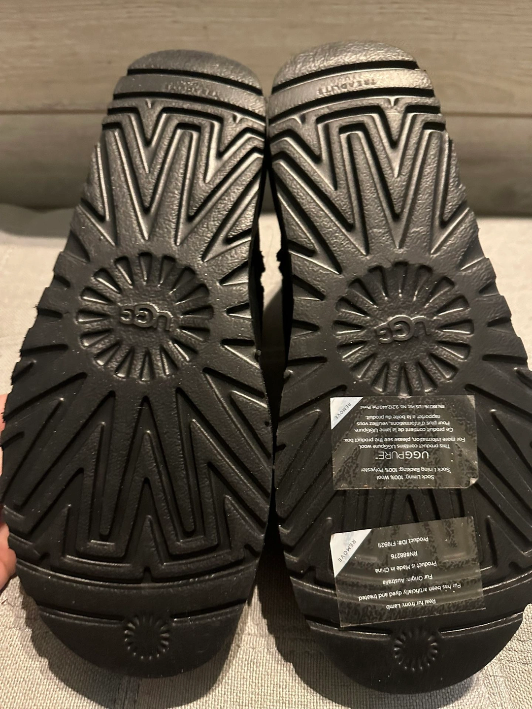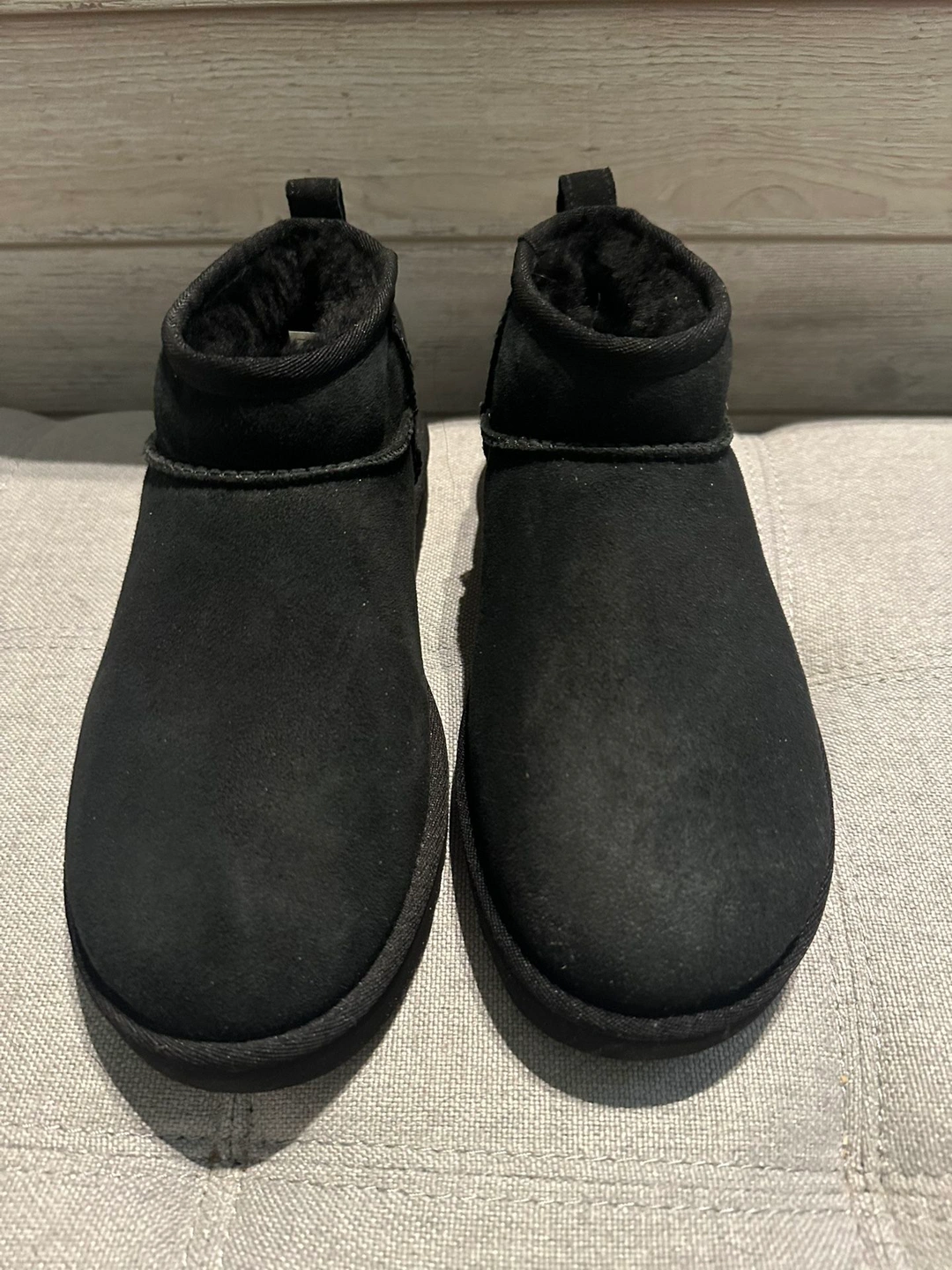 Women’s Ugg classic mini ultra sheep skin class size 7 in black. Never worn, never tried on. Still has inserts in from purchase. Cash only at pick up.